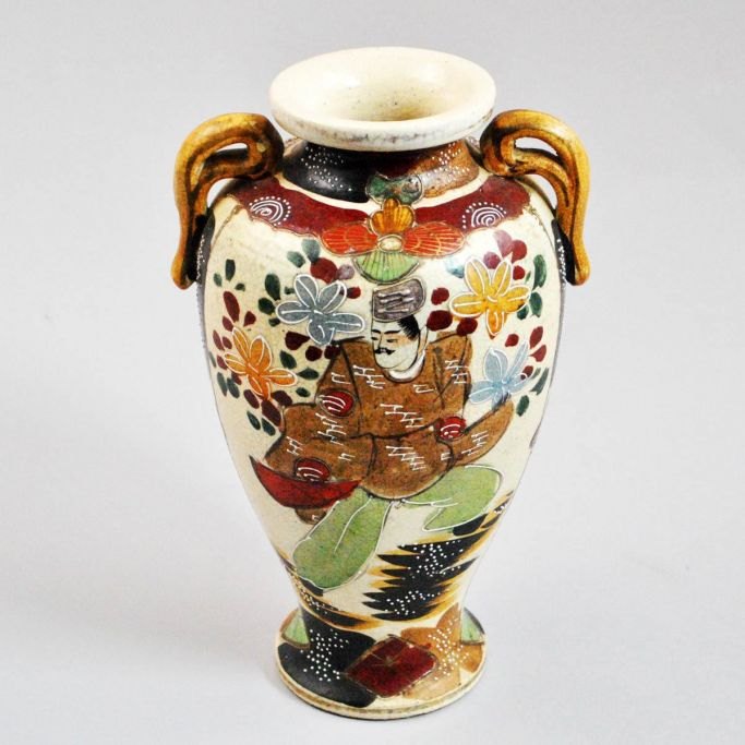 Satsuma vase, Japan, 19. årh. Fajance. Polycrom dekoration i form af krigere. Med hanke. H: 26 cm. Signeret. Made in Japan.
