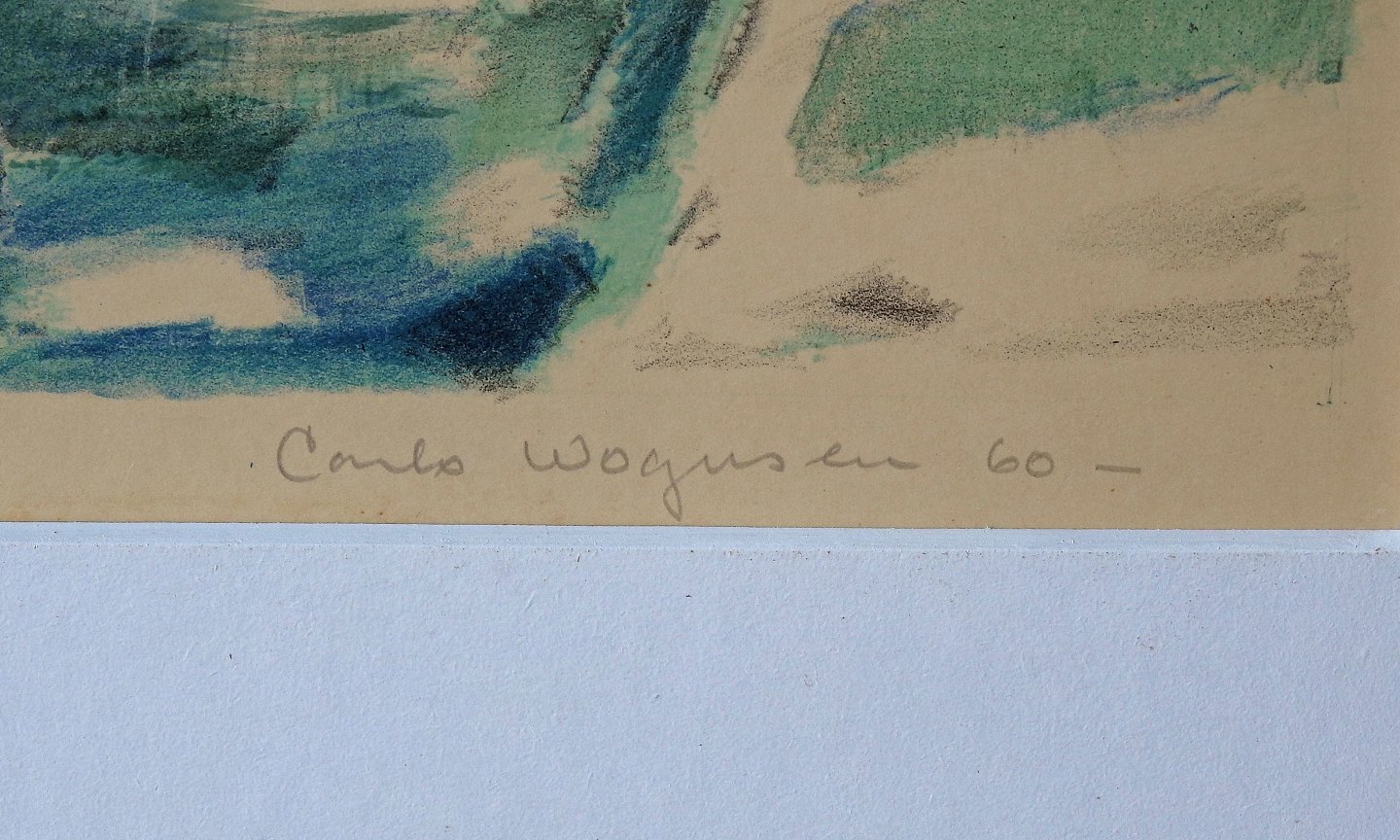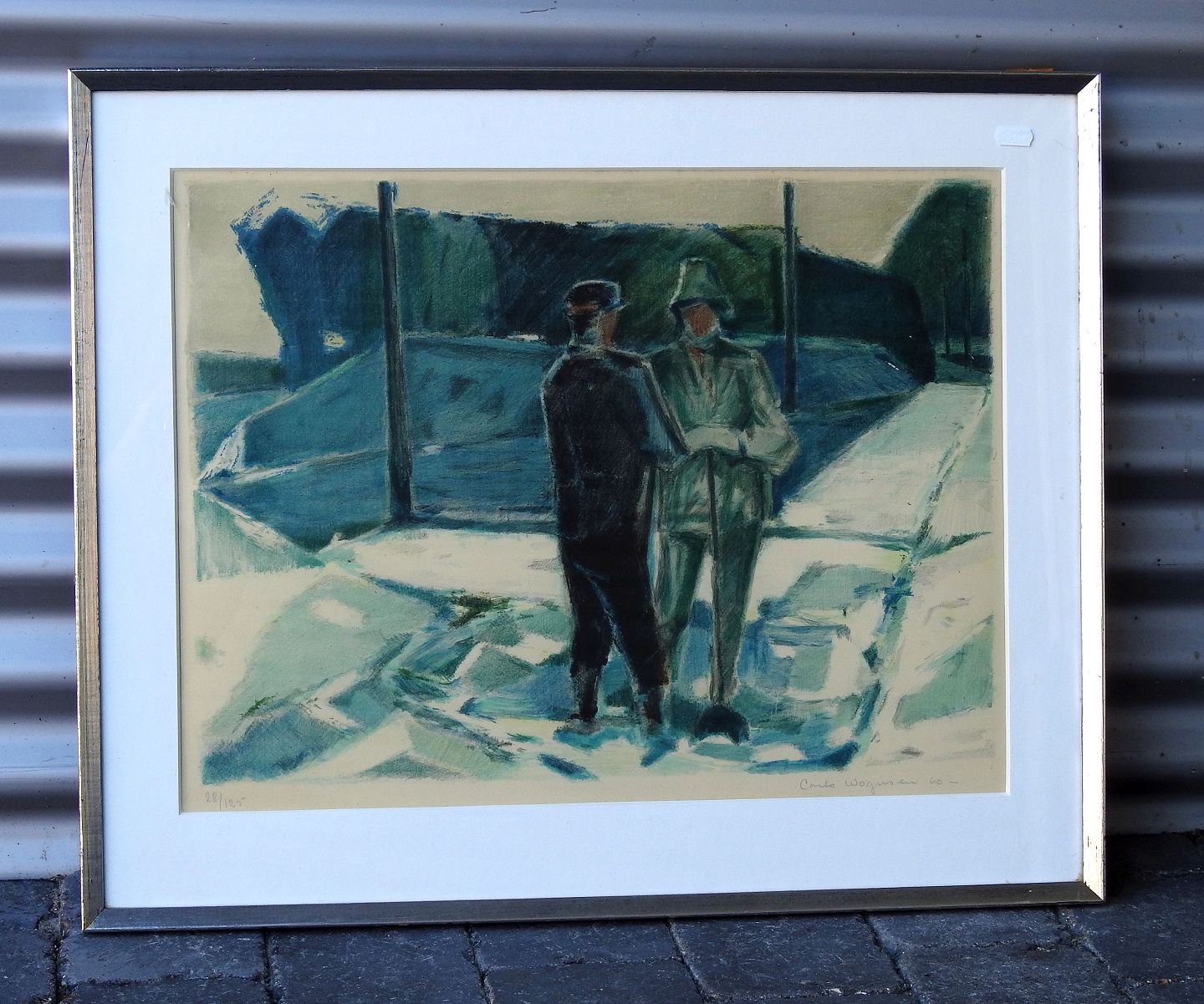 Litografi af Carlo Wognsen med motiv af to mænd i blå nuancer