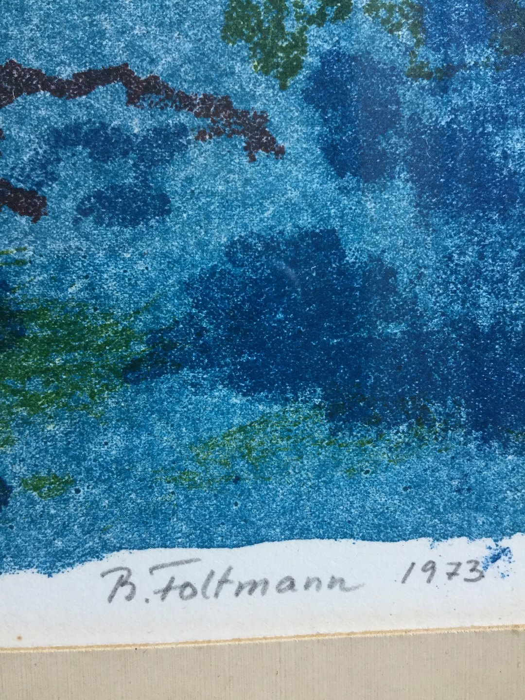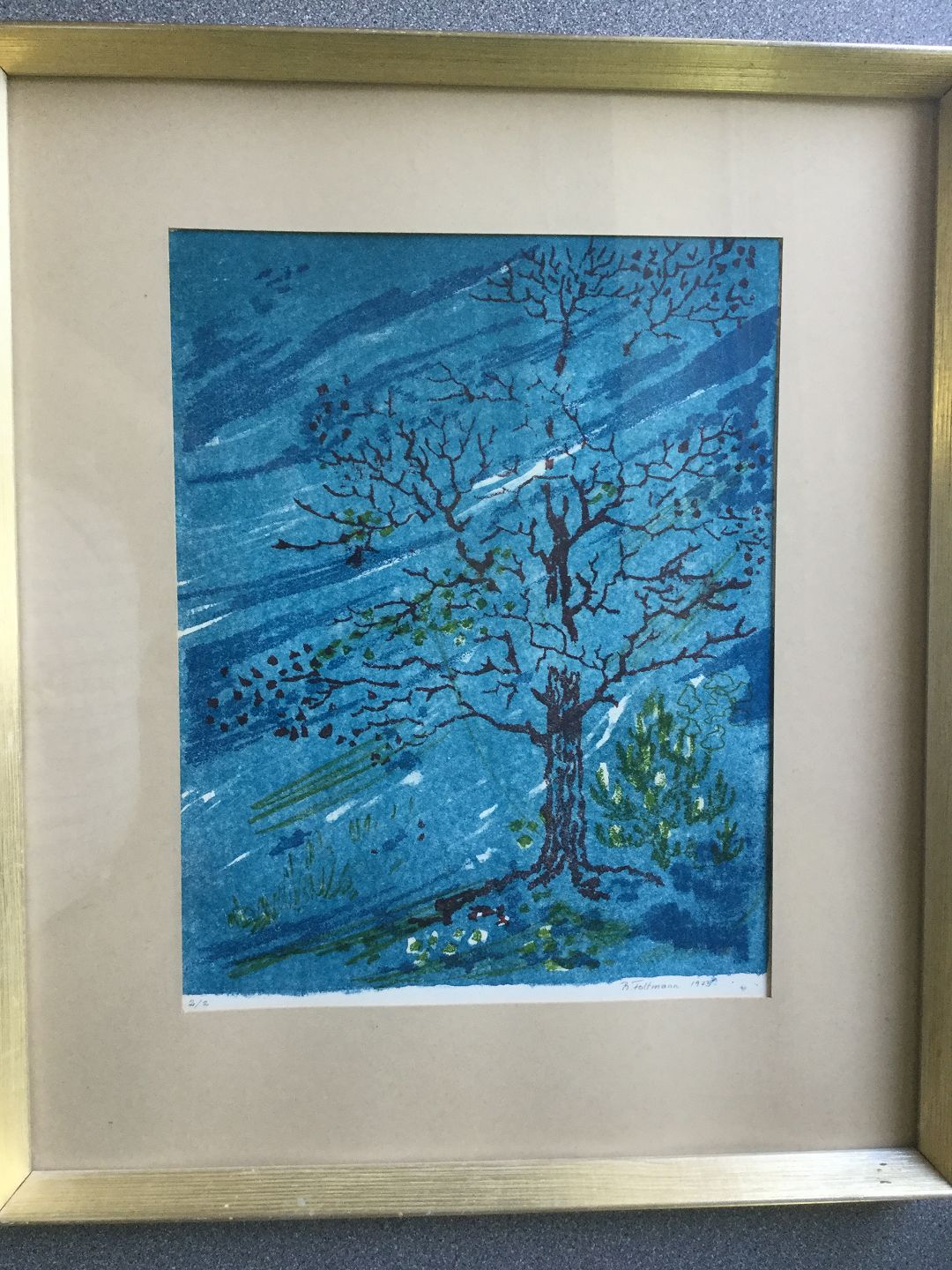 Farvelitografi af Birgit Foltmann 1973 - Nøgent træ i landskab.