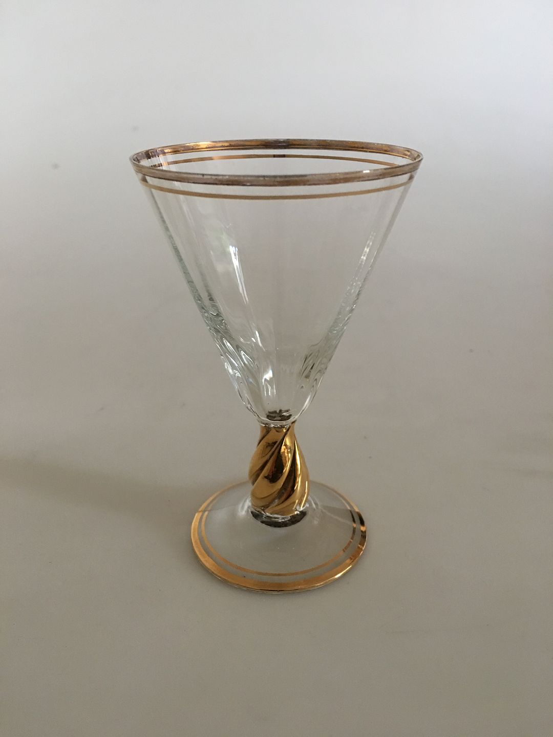 Holmegaard "Ida" hedvinsglas med guld på stilk, rand og fod. Måler 10,4 cm Høj x 6,5 cm diameter.