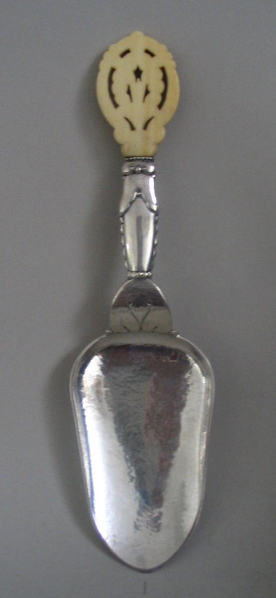 Silver spatula, hammered, Denmark, 1916. With leaf ornament on the shaft and with a bone handle. L .: 26 cm. Weight: 107 grams.