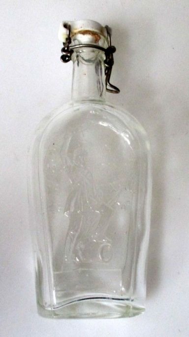 Lommelærke med Bissens landsoldat med patentprop, Fyns Glasværk efter 1899. Danmark. Med devise. Klart glas. 1/8 pot. Højde: 16,8 cm.  Patentprop med den franske lilje også kaldet Odenseliljen. Litteratur: Danske Lommelærker, p. 85 f og 162 f.