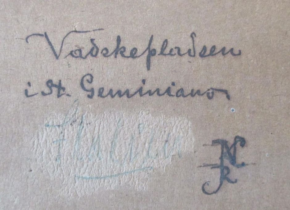 Rosenstand, Vilhem (1838 - 1915) Danmark: Vaske pladsen i St. Geminiano, Italien. Olie på pap. Monogrammeret. 16,5 x 27 cm.