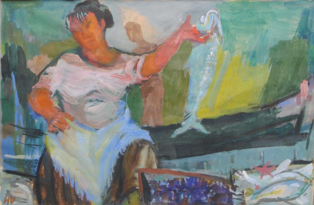 Veltman, Han (1928-) Holland: Fiskehandler. Gouache på papir. 15,5 x 24 cm. Signeret: HV