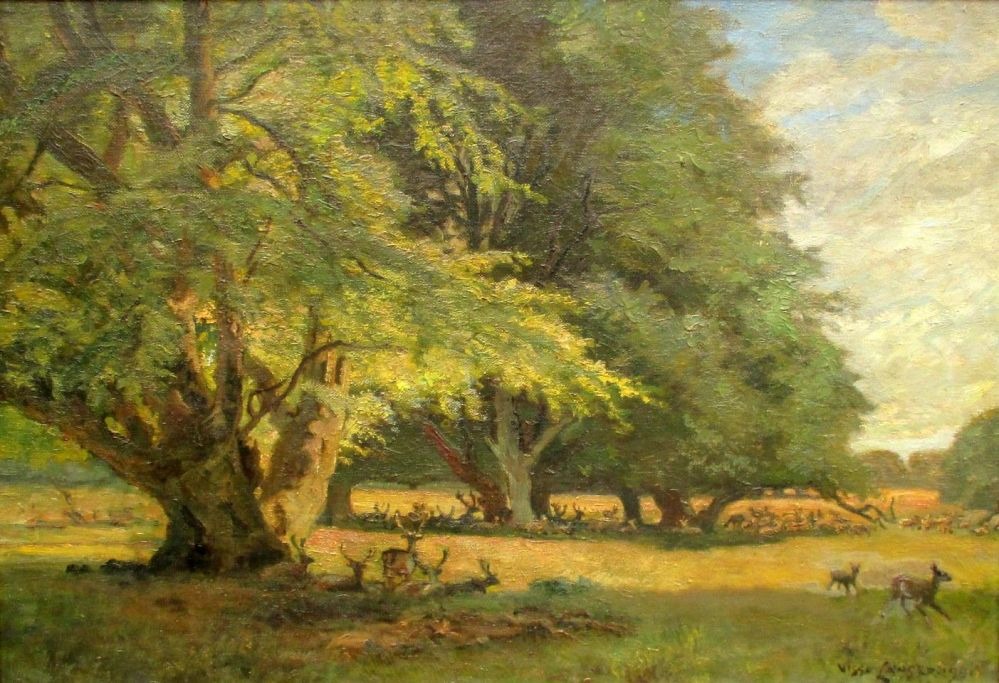 Langer, Viggo (1860 - 1942) Danmark: Parti fra Jægersborg Dyrehave - Spring forbi. Olie på lærred. Signeret.: Viggo Langer 1940. 50 x 75 cm.