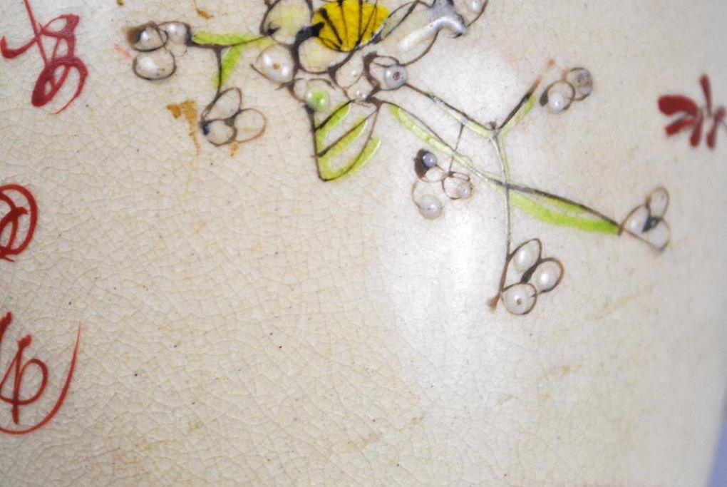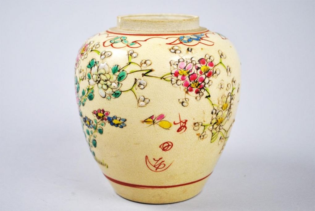 Japanese bojan. Faience. o. 1900. Without lid. Polycrom decoration with flowers. Signed. H: 14 cm.