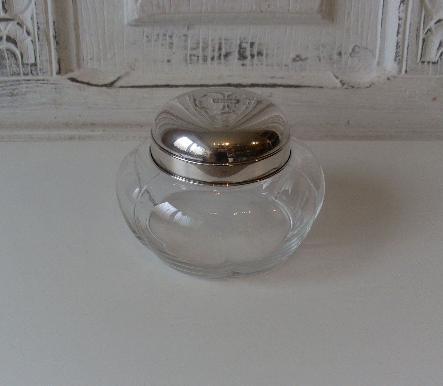 Bon bonnier i glas med låg af sterlingsølv