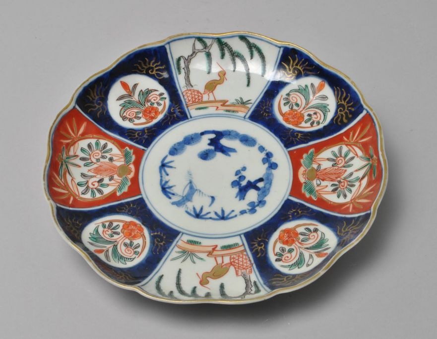 Imari Japanese porcelain plateau, 19th century. Decorated with plant ornaments and cranes. Dia: 21.5 cm.