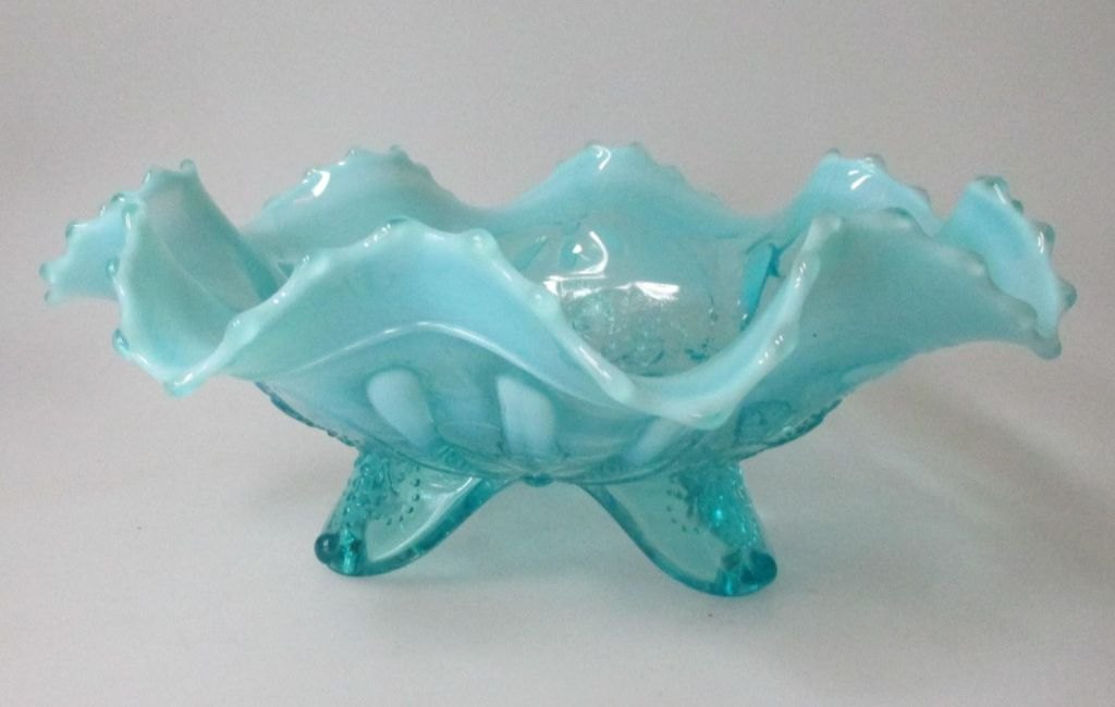 Pressed English table bowl, 19th century. Light blue glass. Decorated with leaves. Probably: Sowerby. Height: 9 cm. Dia: 22 cm.