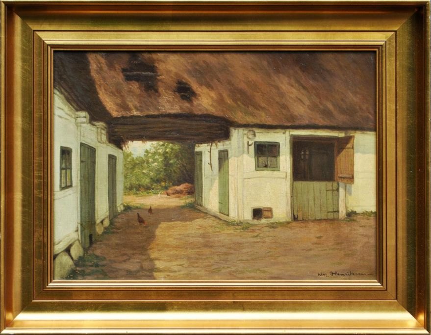Henriksen, William M. (1880-1964) Denmark: Farm interior with chickens. Oil on canvas. Signed: WM Henriksen. 41 x 57 cm.