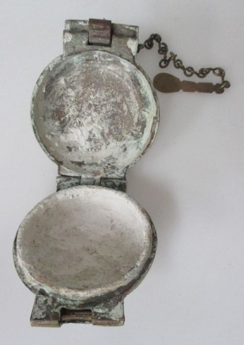 Indisk bronze beholder til brændt kalk, 19. årh. Til betel tygning. Beholder dekoreret med bladværk. Med kæde, hvori der er en lille ske i messing. Dia.: 9,5 cm. H.: 5 cm. Betelnød, betelblade og brændt kalk blandes, og lægges tilrette i kinden. Efter en tid kan man spytte rødt spyt i en lang stråle.