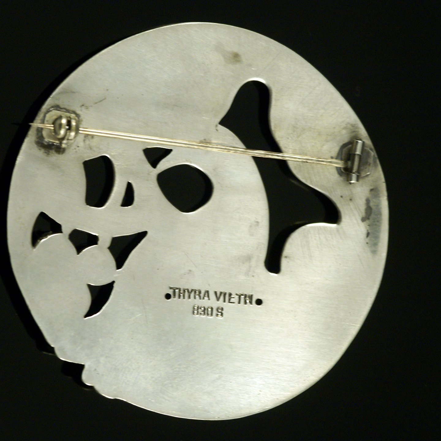 Thyra Vieth. Skønvirke Broche i Sølv med rav og grøn agat.