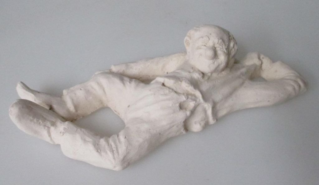 Carlsen, Poul Hauch (1921 - 2006) Danmark: En liggende klovn, der trækker sig selv. Stentøj. Uglaseret. Signeret. Længde.: 18,5 cm. Højde.: 4,5 cm.