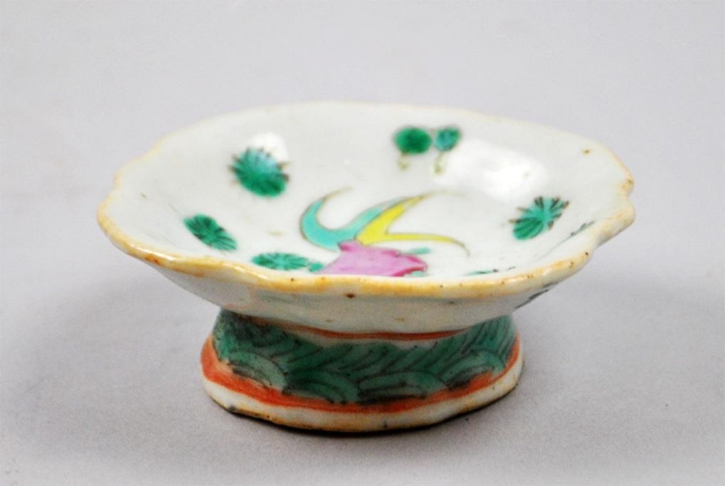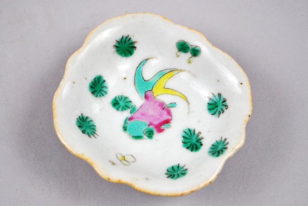 Kinesisk porcelæns skål. Famille rose. 19. årh. Polykrom dekoration med guldfisk. H: 3 cm., Dia.: 7 cm.