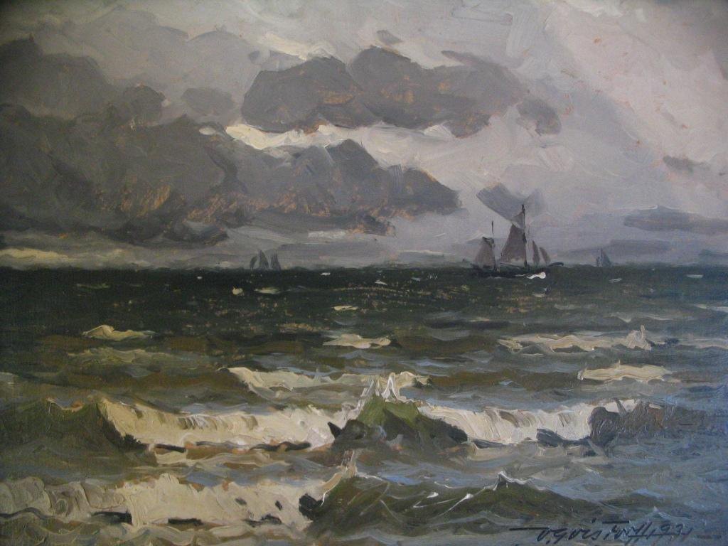 Qvistorff, Victor (1882 - 1953) Danmark: Sejlskibe på Sundet. Olie på pap. Sign.: V. Qvistorff 1931.18 x 23 cm.