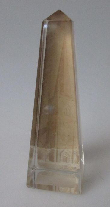 Glas brevvægt, pyramide formet, Danmark, ca. 1910 - 1920. Med opklæbet foto af kirke. Højde.: 11 cm.