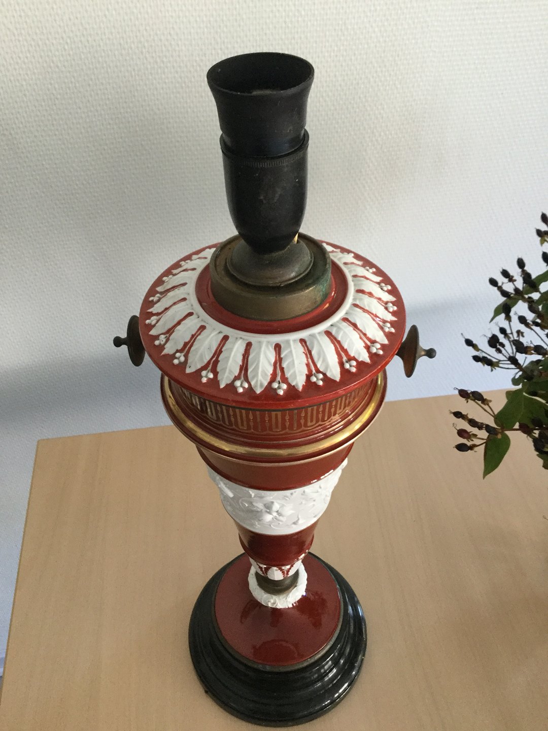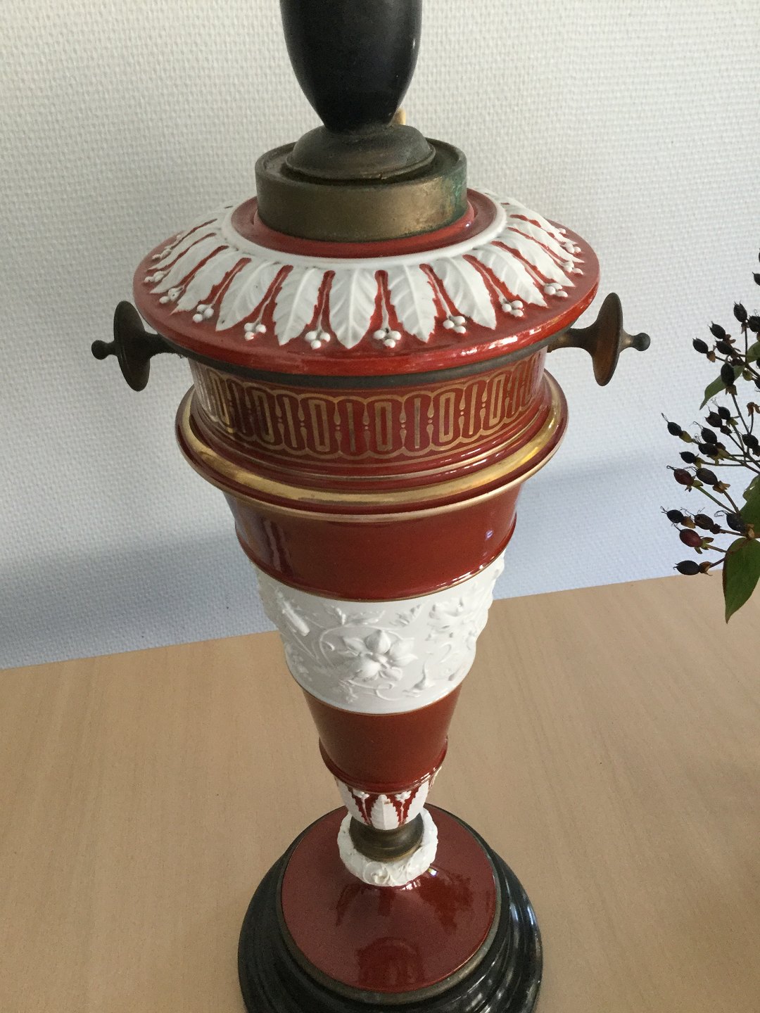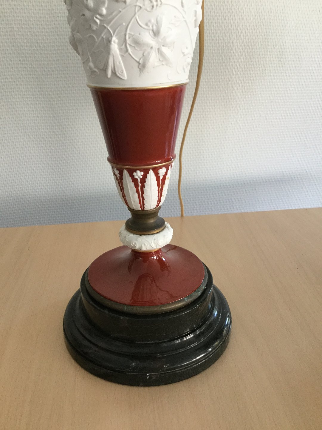 Sort marmor sokkel, terrakotta farvet porcelæn med friser af bisquit porcelæn.