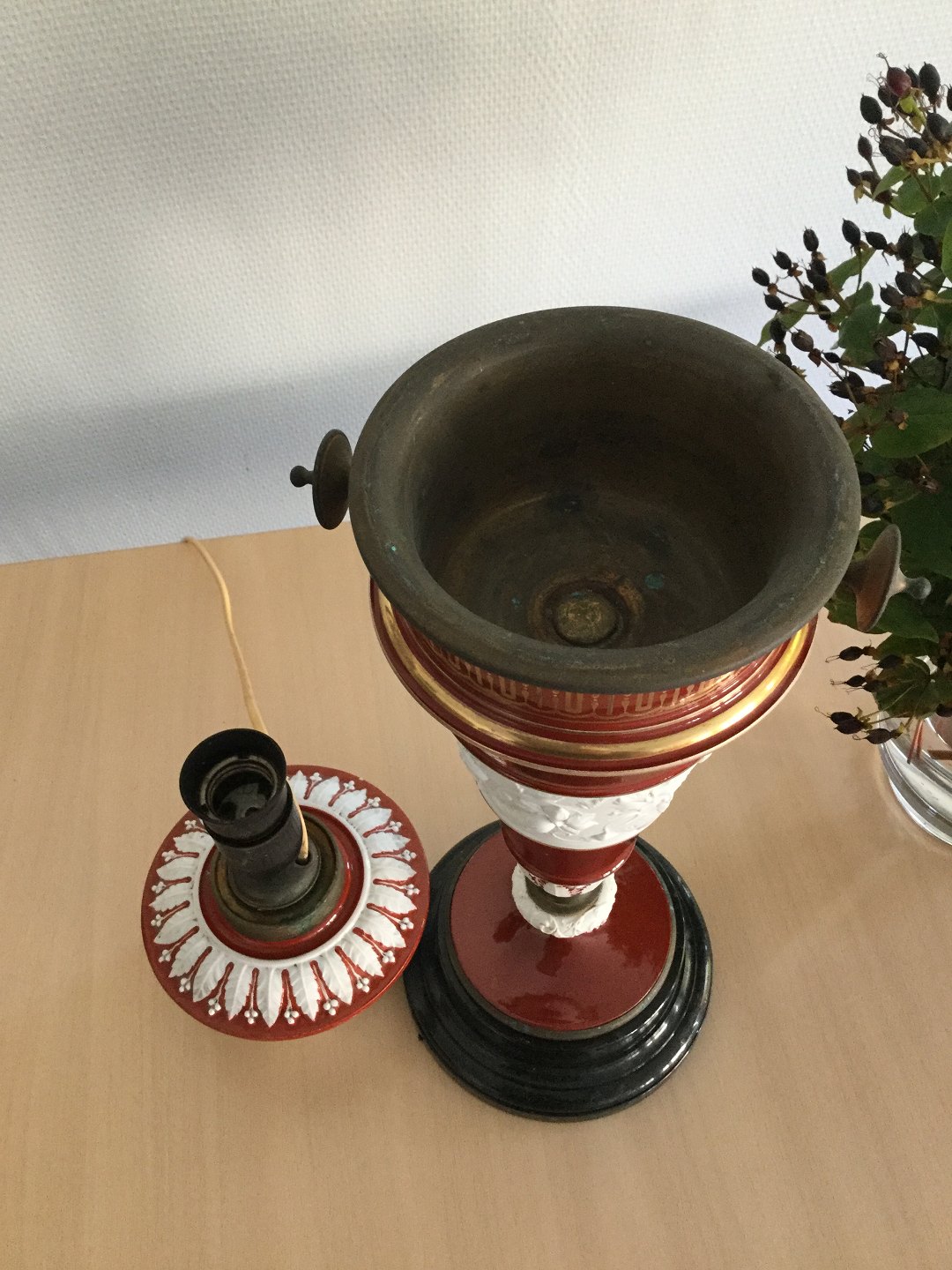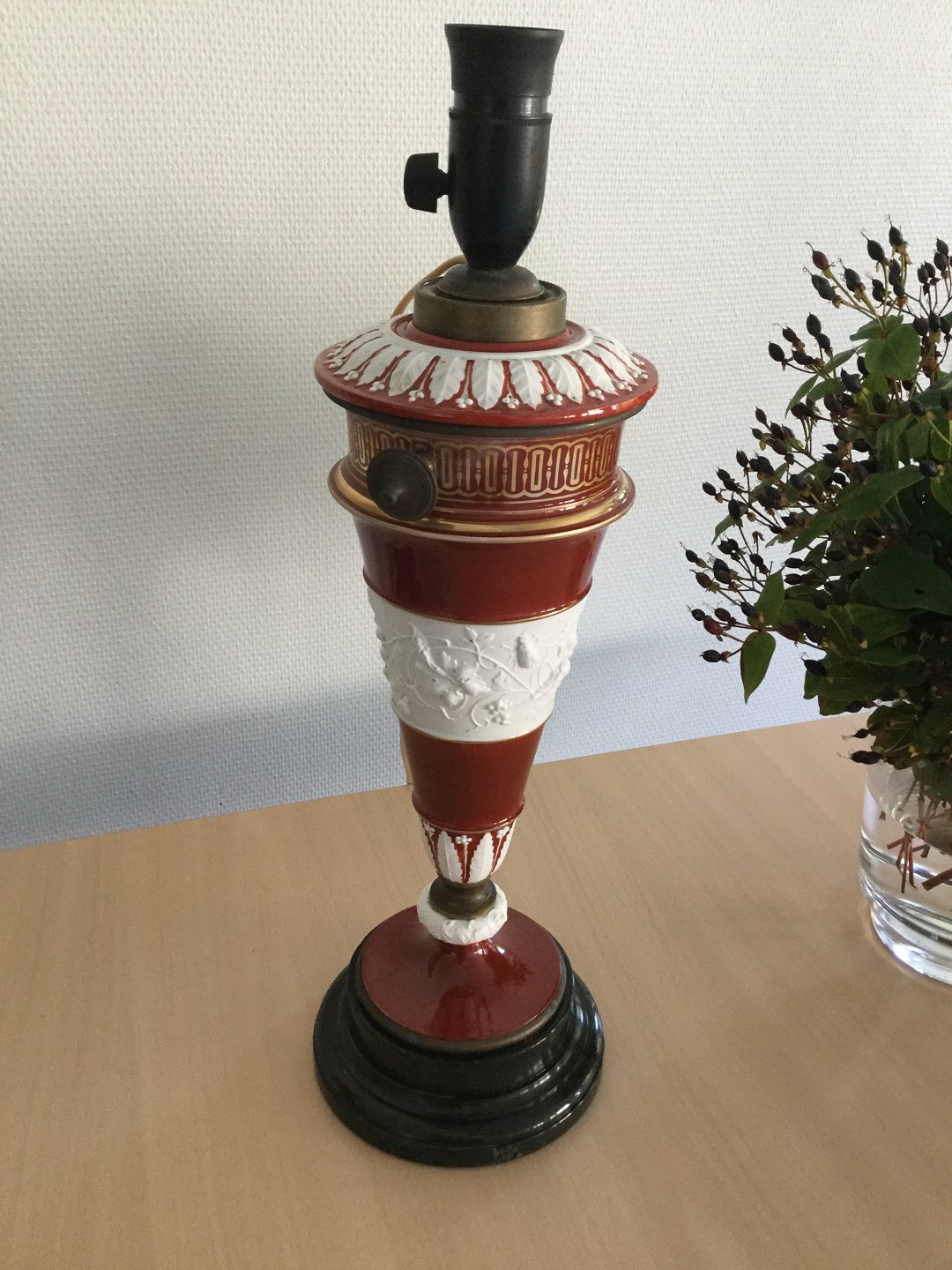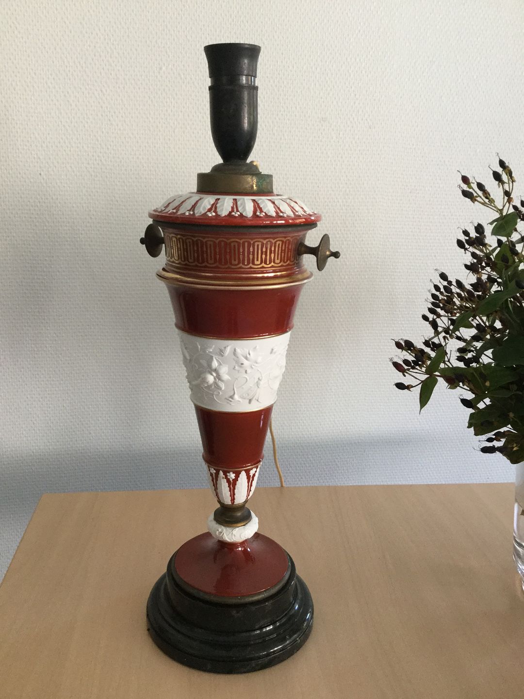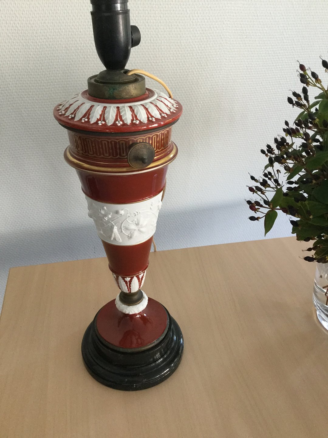 Sort marmor sokkel, terrakotta farvet porcelæn med friser af bisquit porcelæn.