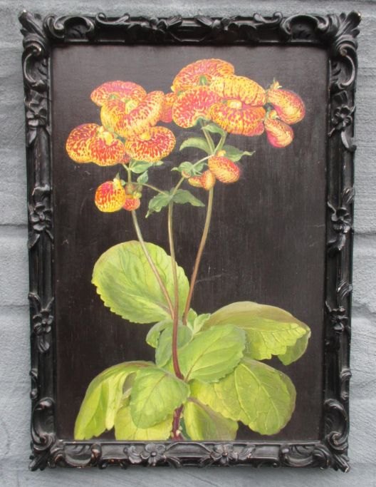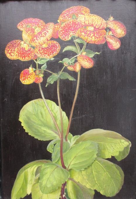 Dansk kunstner (20. årh.): Tøffel blomster. Calceolaria. Olie på pap. Signeret verso: Bertha Stage 1924. 34 x 23,5 cm.