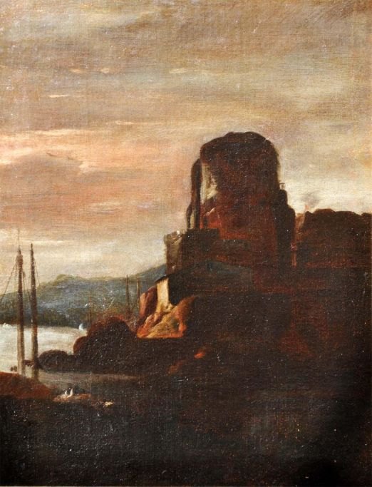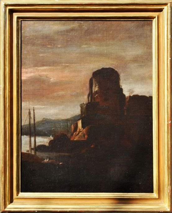 Italiensk kunstner (17. årh.): Klippekyst med skibe. Betegenet verso: SC 67.  47 x 36 cm.