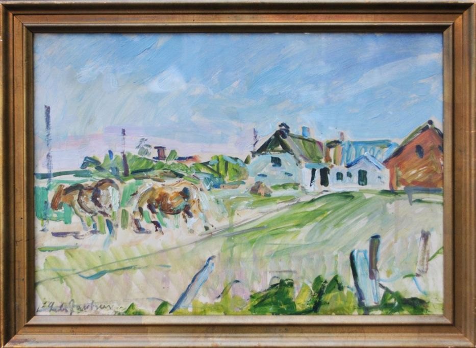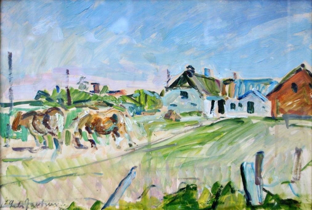 Jacobsen, Ludvig (1890 - 1957) Danmark: Heste ved en gård.