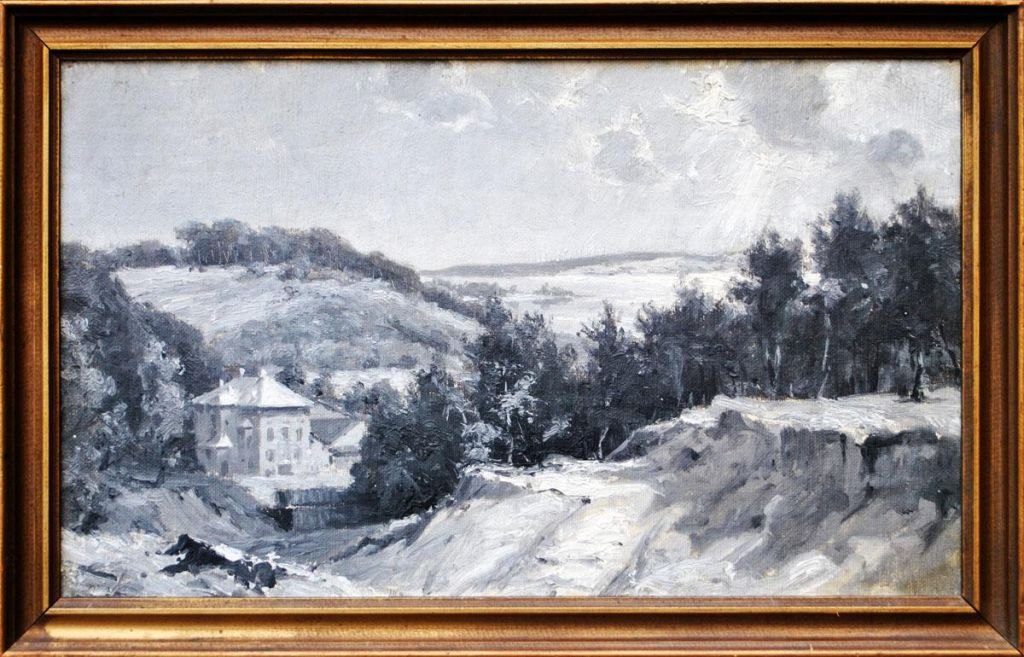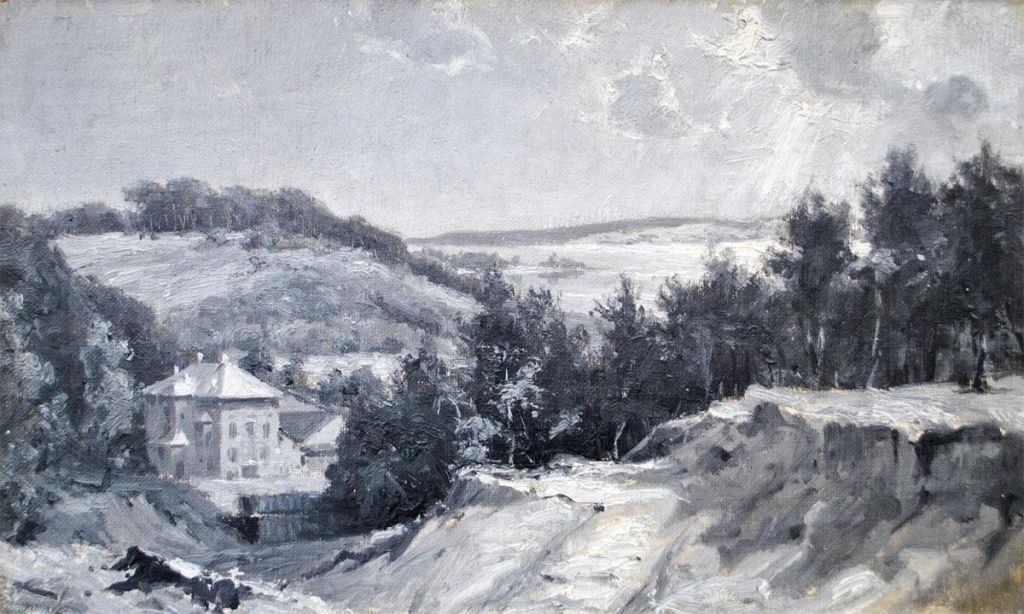 Soya-Jensen, Carl Martin, (1860 - 1912), Danmark: Landskab. Grisailles. Olie på lærred/pap. Betegnet på bagsiden: Soya - Jensen. 20 x 33 cm.