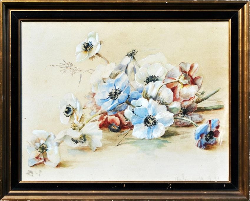 English artist (19th century): Arrangement with flower bouquet on a table. Signed: M. Simers 19.3.91. 39 x 49 cm.