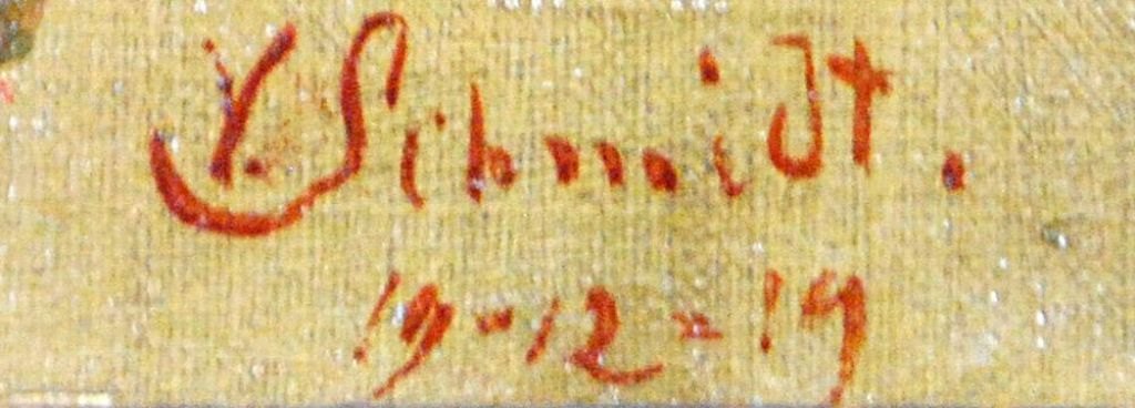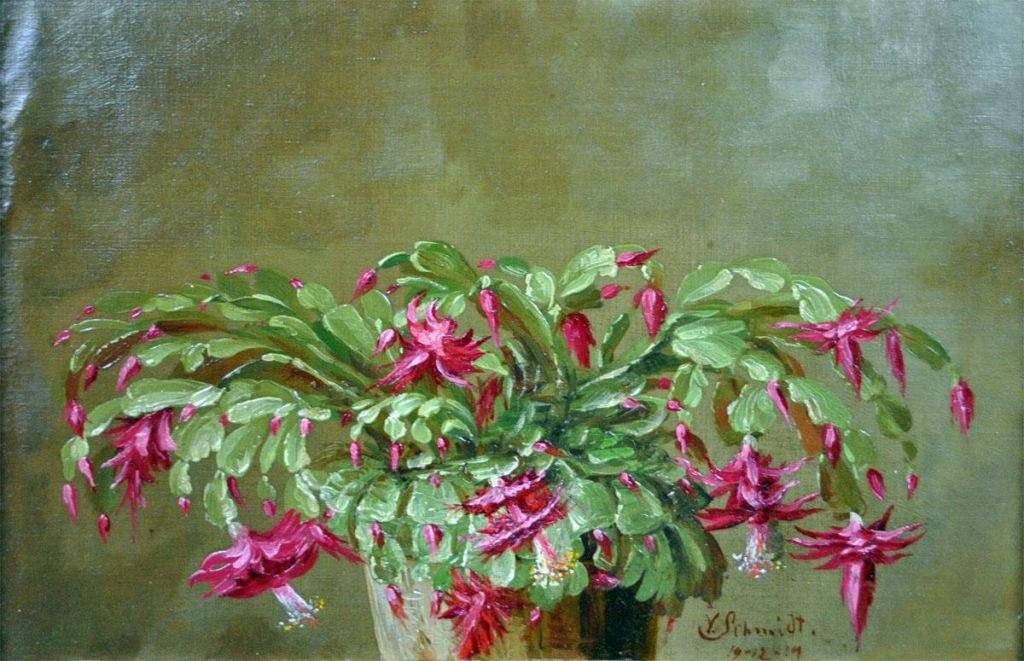 Schmidt, V. (19. årh.) Danmark: Opstilling med plante. Olie på lærred. Signeret.: V. Schmidt. 23 x 33 cm.