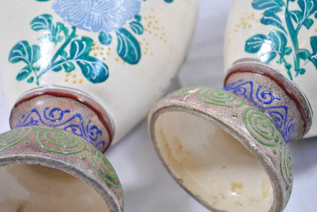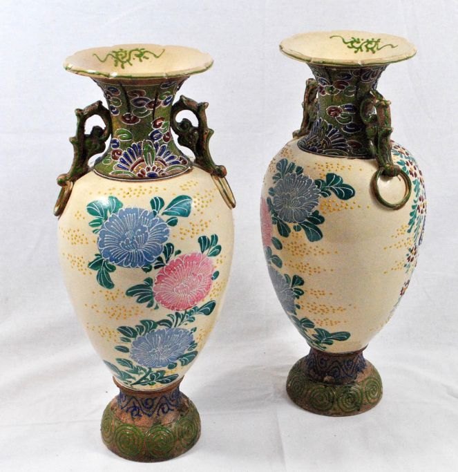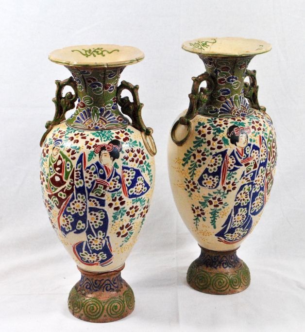 Pair of Japanese Satsuma vases. 19th century. Faience. Polycrom decoration in the form of flowers and people. Signed. H. 37.5 cm.
