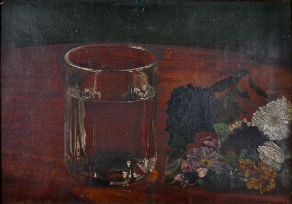 Huus, Eduard 19. årh. (Danmark): Opstilling med blomster og vandglas. Olie på pap. Signeret.: Eduard Huss 78. 18 x 25 cm.