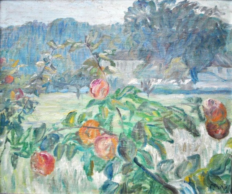 Wolmar, Gustaf (1880-1971) Sverige/Danmark: Et æbletræ. Olie på lærred. Signeret.: Monogram. 43 x 52 cm. På bagsiden anført, at arbejdet er fra 1910.