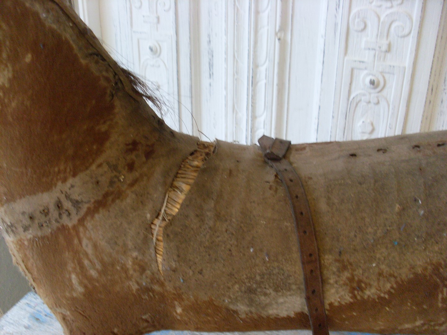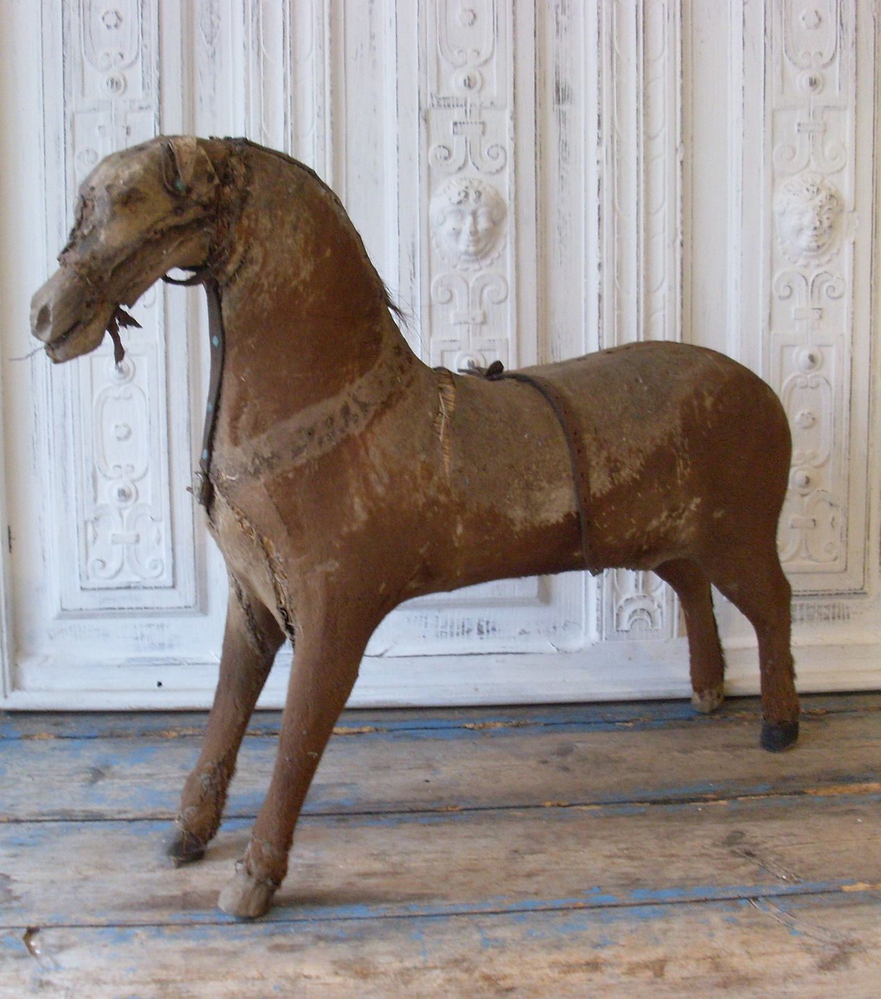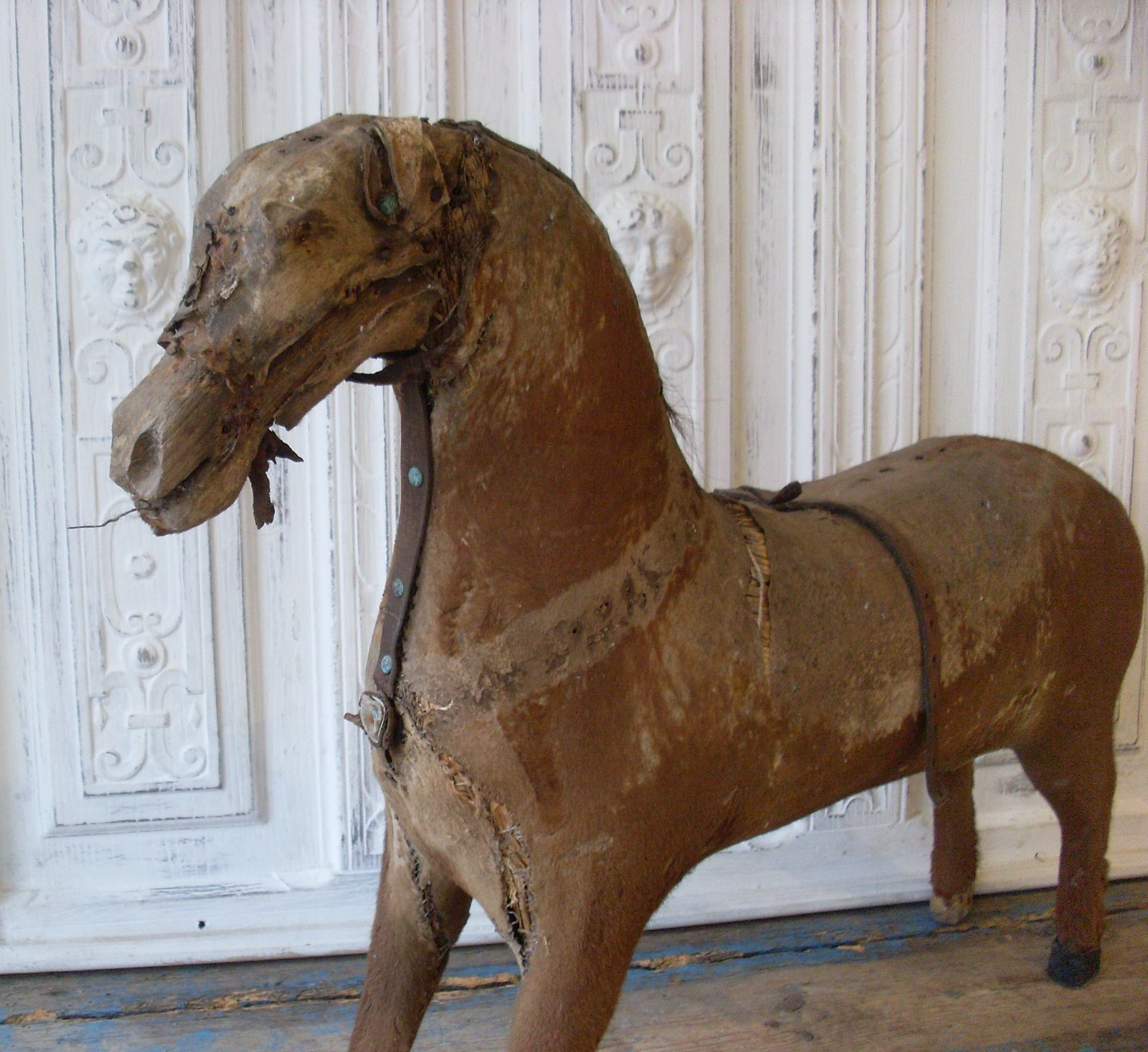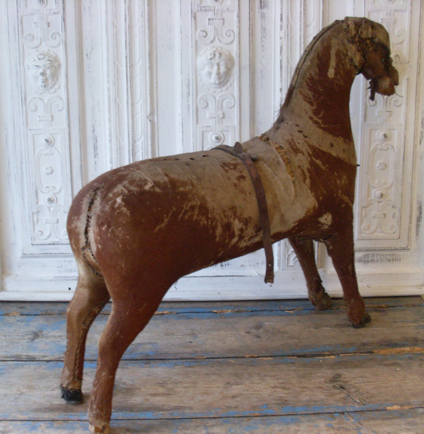 Skøn gammel hest fra slutningen af 1800tallet. Hesten er lavet af træ og halm, betrukket med føl-skind.