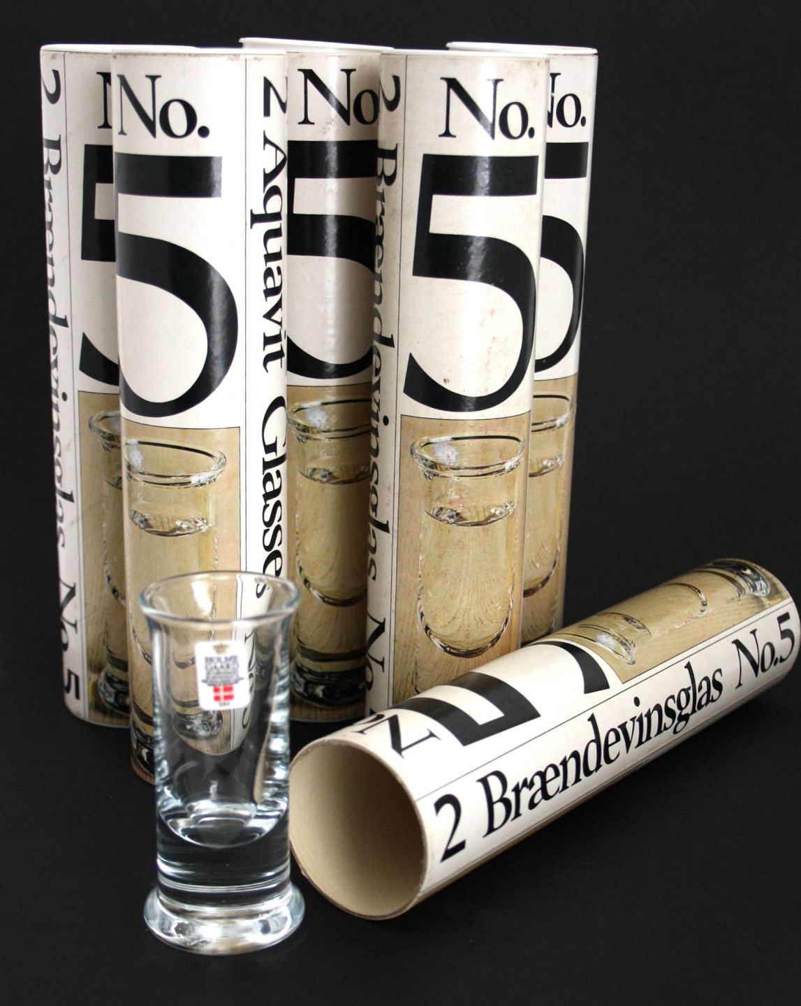 Holmegaard, No.5 snaps i origianal rør med 2 stk. Designet af Per Lütken i 1970. Højde 9,5 cm.