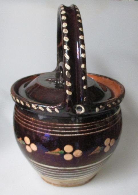 Maternity, Winther (1838 - 1919) Sønderborg, 19th century. Denmark. With handle and dark brown glaze exterior. Decorated with flowers. Lid decorated. Height: 34 cm. With hair crack in the lid.