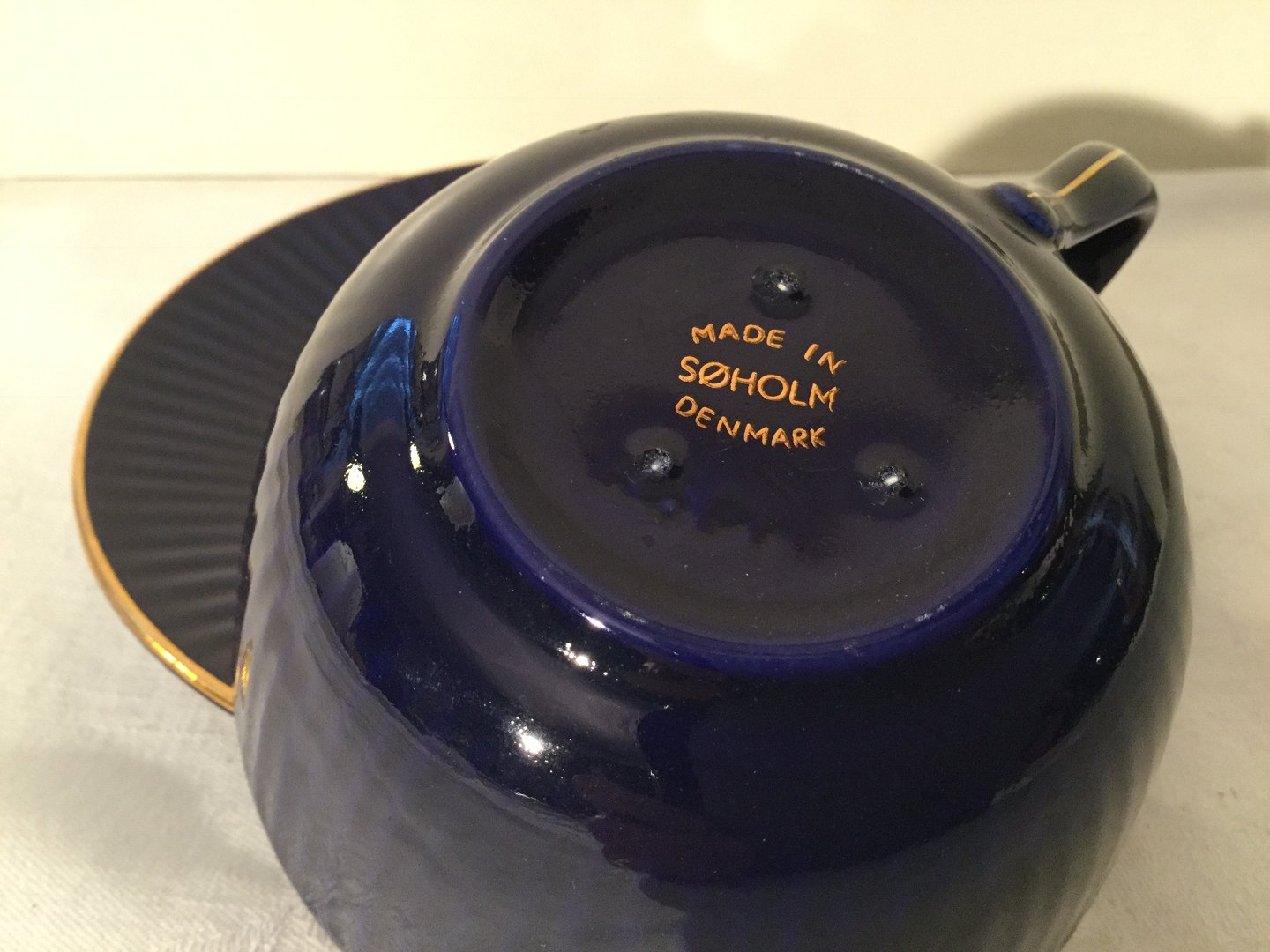 Bornholmsk keramik, Søholm, Tekop sæt, Blå med guldkant *Pæn stand*