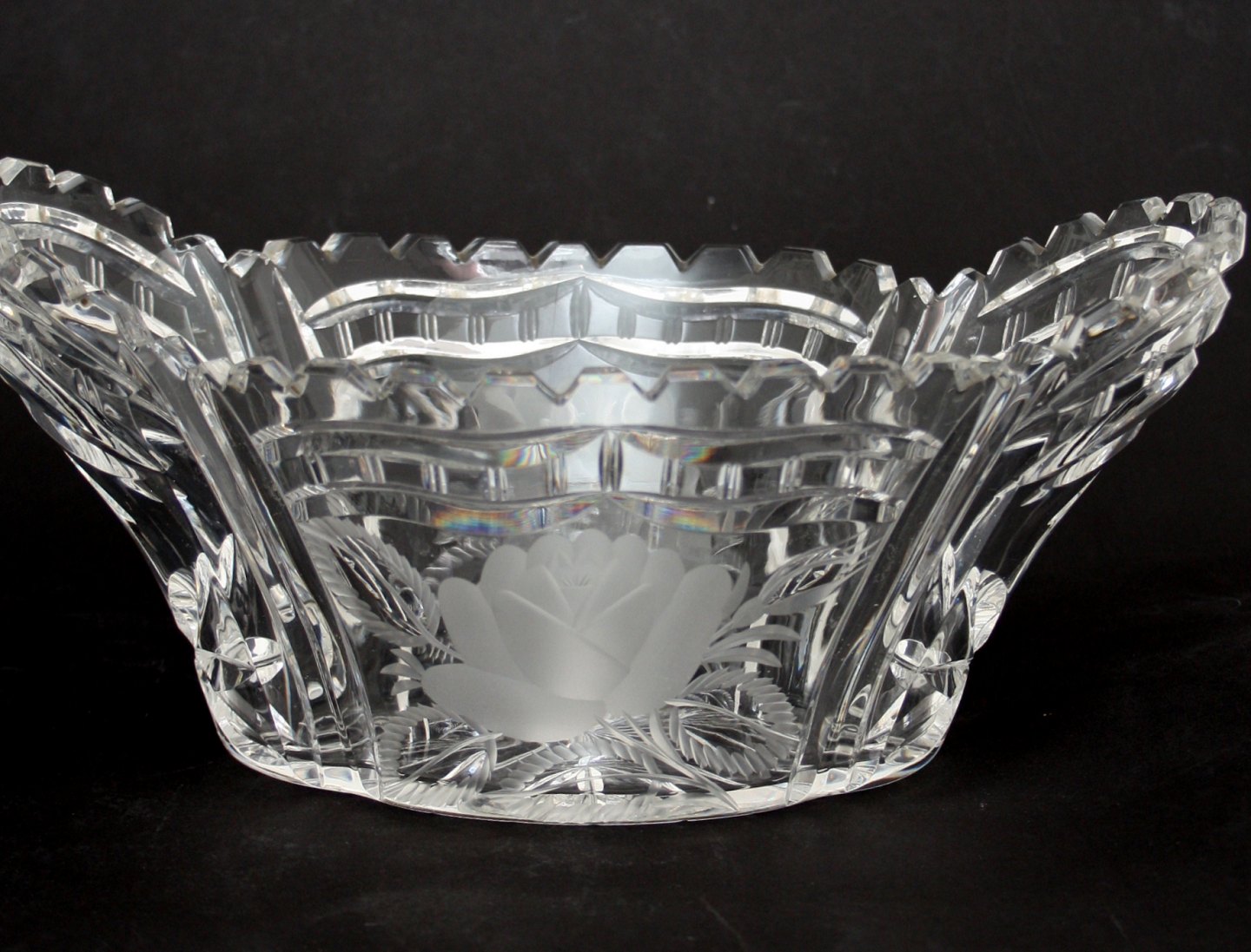 Krystal skål, aflang med fine slibninger og matslebet blomst. Længde 28 cm. Højde 12,5 cm. Bredde 16 cm. Pris: 425 kr.