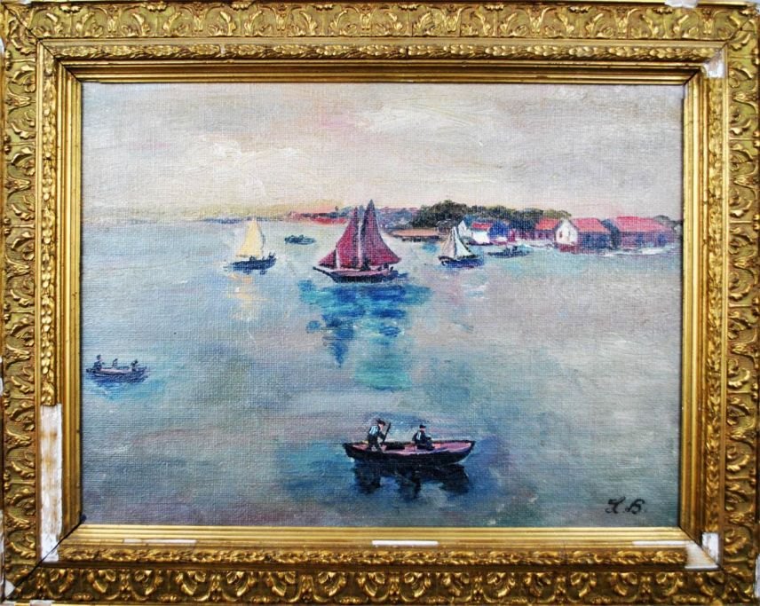 Bonfils, Louise (1856 - 1933) Danmark: Marine med både. Signeret: Monogram. Olie på lærred. 28 x 38 cm.