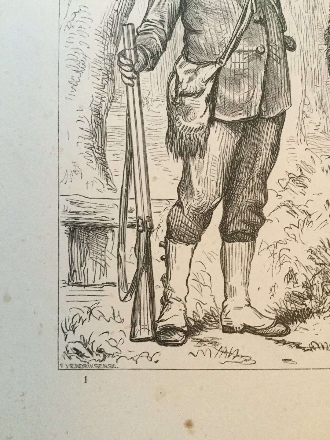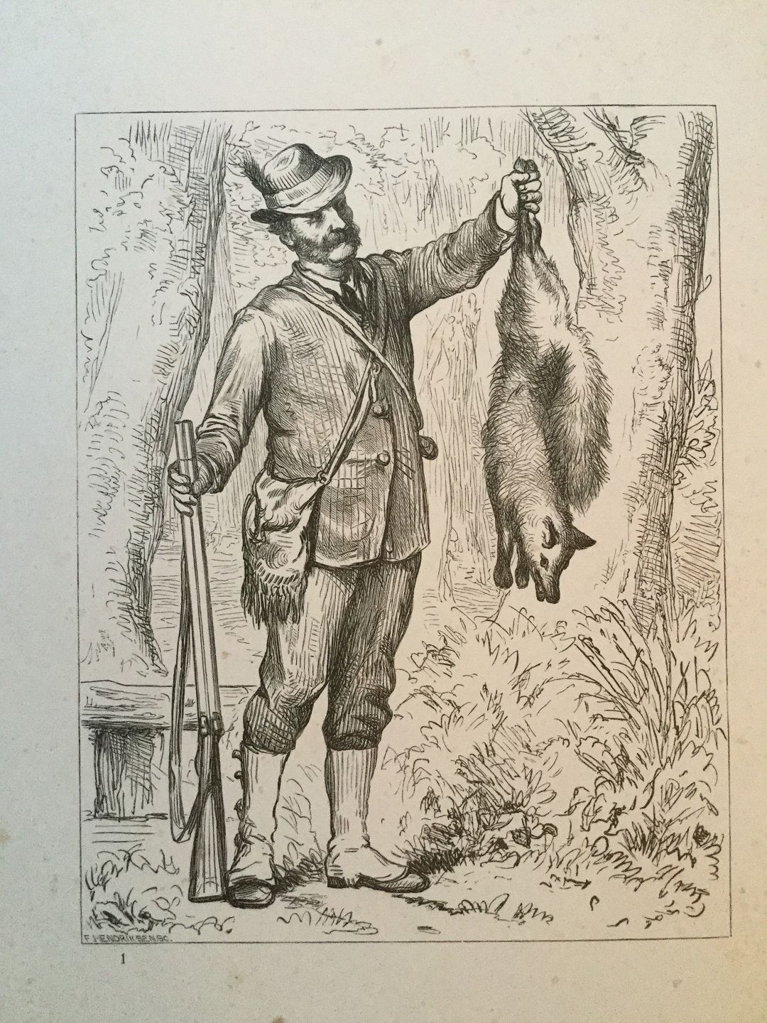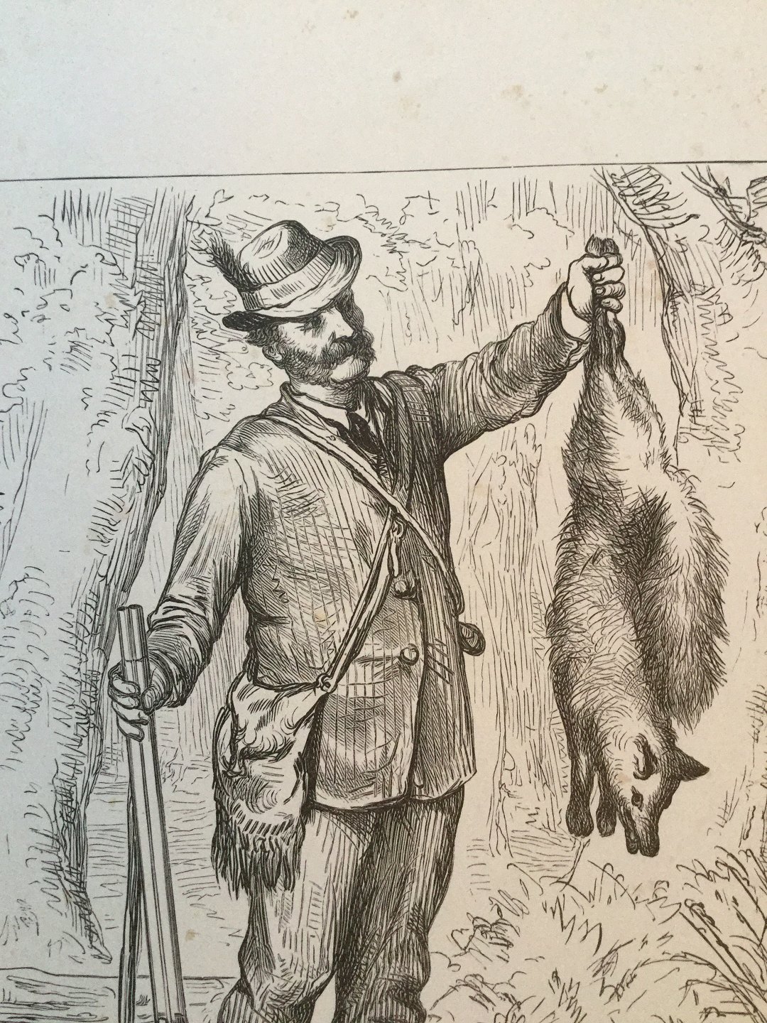 Xylografi af Frederik Hendriksen 1875 - Jæger med ræv.
