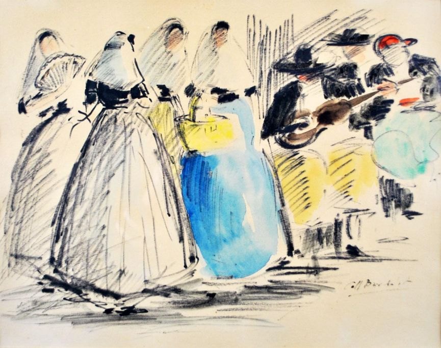 Bardolet, Josep Coll (1912 - 2007) Spanien: Kvinder hører musik. Farvelitografi. Signeret.: Coll Bardolet. 31 x 39 cm.