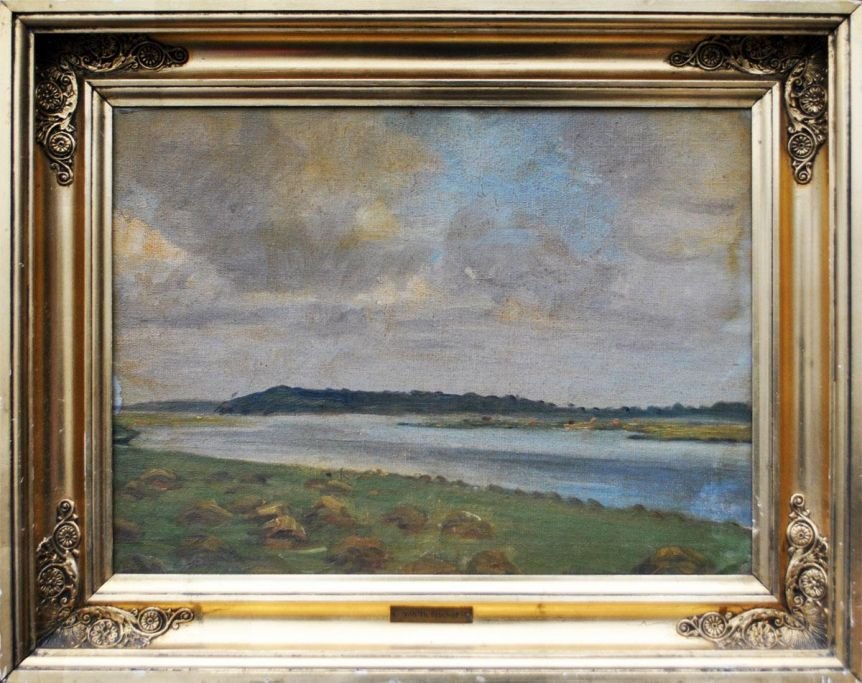 Fischer, Vilhelm Theodor (1857 - 1928) Danmark: Et å løb. Skitse. Olie på lærred/opklæbet på pap. Usigneret. 30 x 40 cm.
