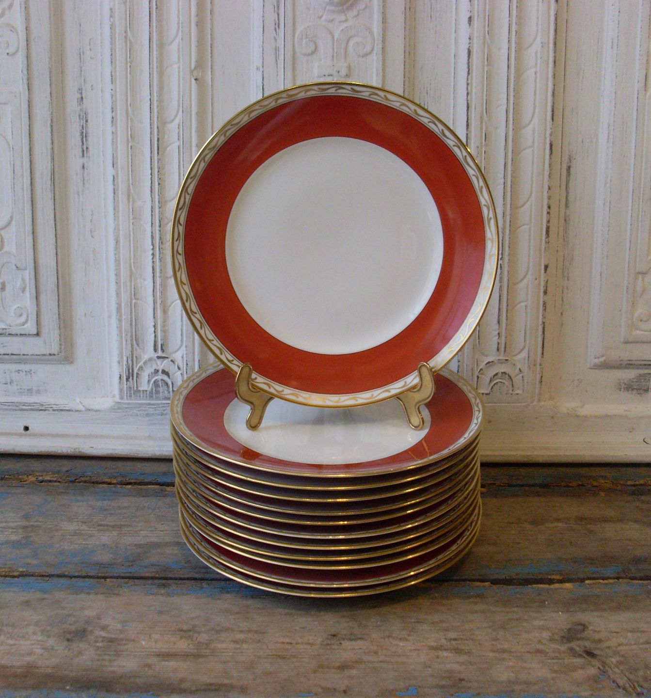 Royal Copenhagen dækketallerkener dekoreret med guld og teglfarvet fane.