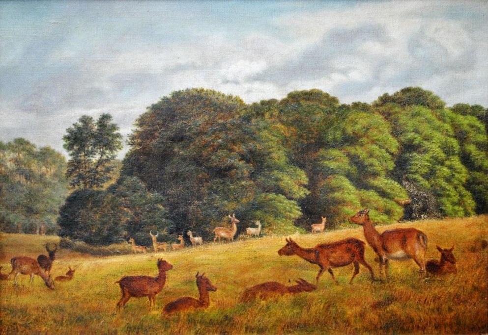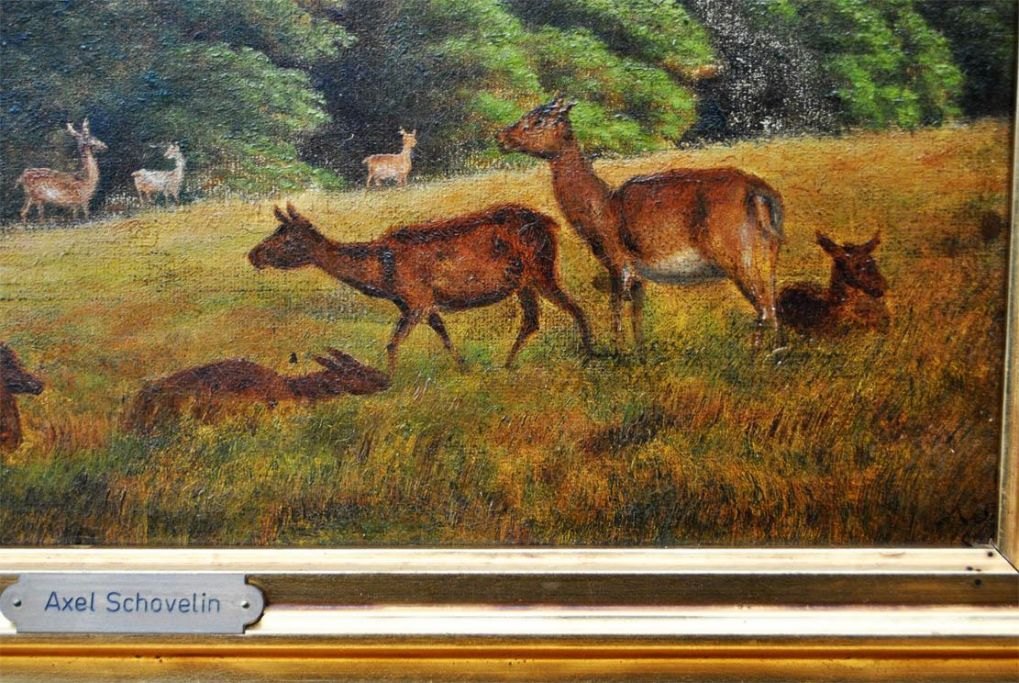 Schovelin, Axel (1827 - 1893) Danmark. Dyr i Dyrehaven. Olie på lærred. Signeret 1875. 26 x 38 cm.
