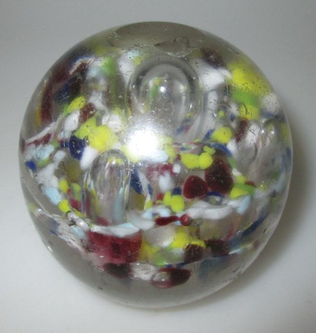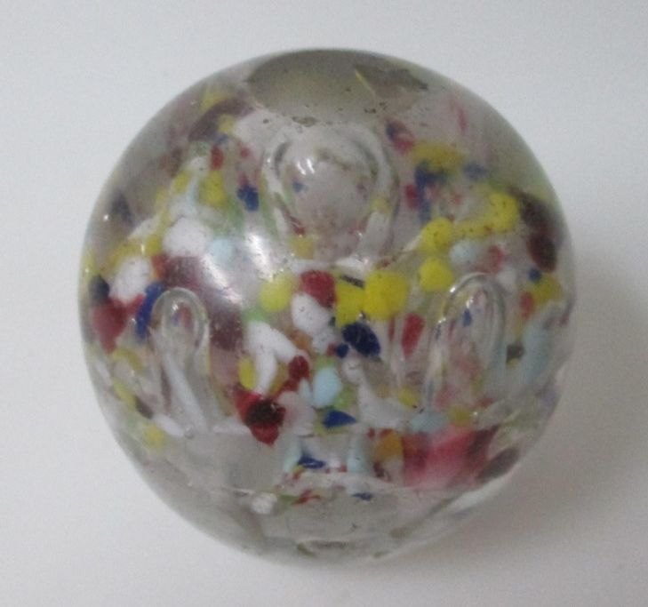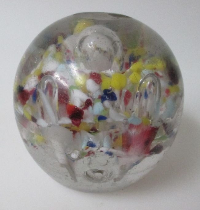 Brev vægt, 19. årh. Danmark. Klart glas indlagt med flerfarvet glas og luftbobler. Højde.: 7,5 cm. Dia.: 7,5 cm.