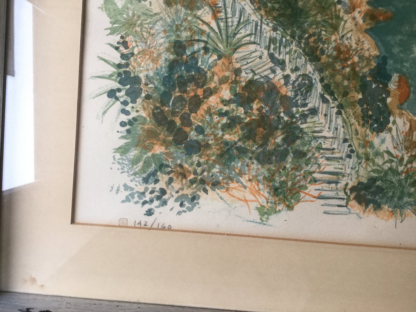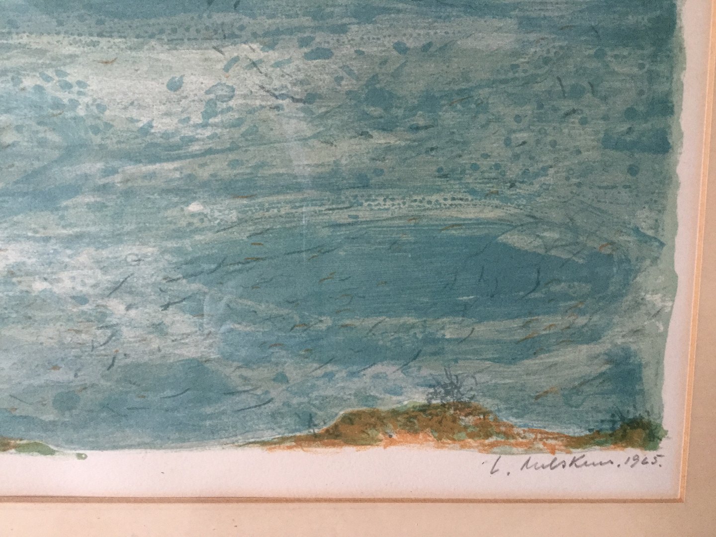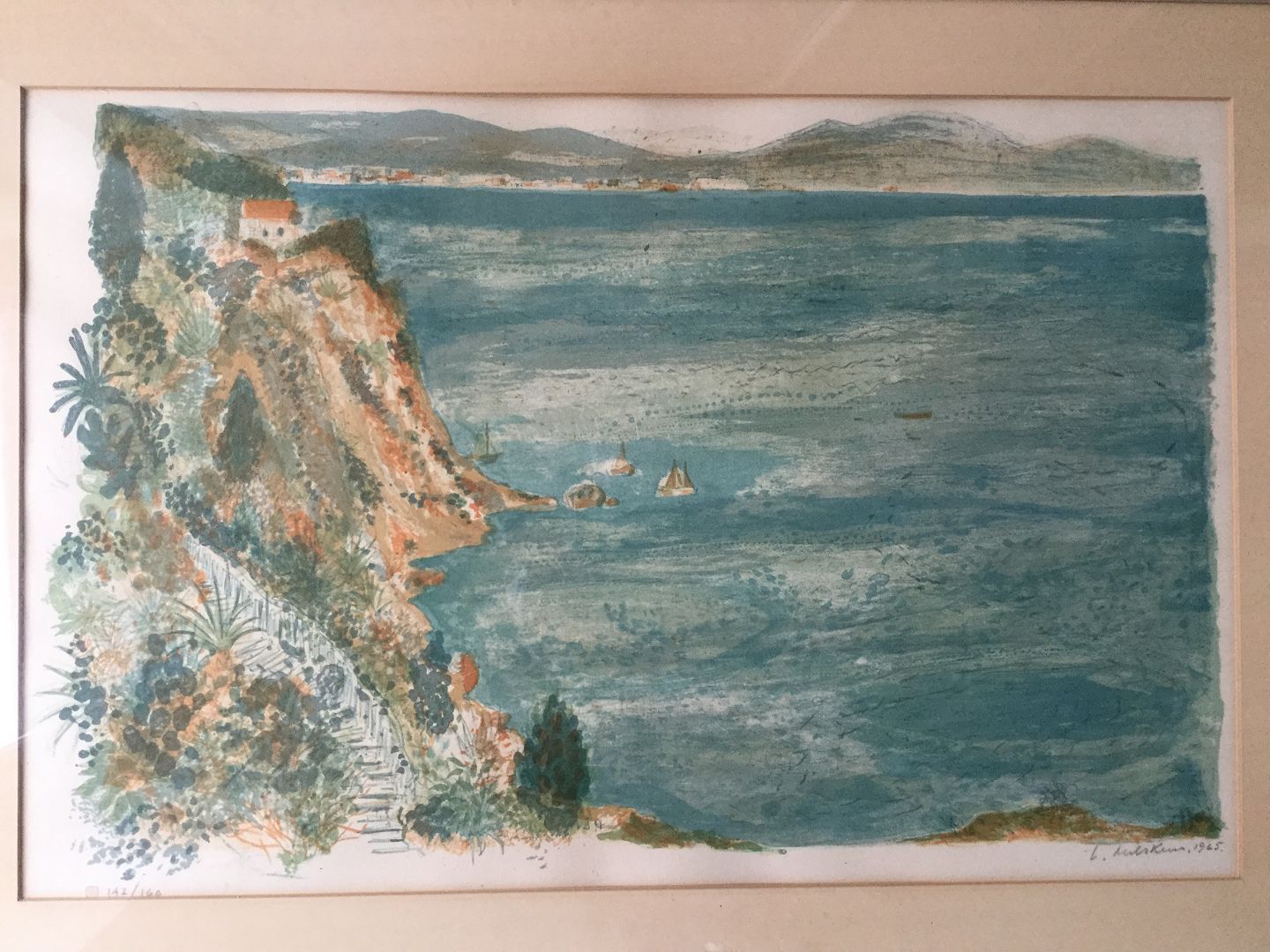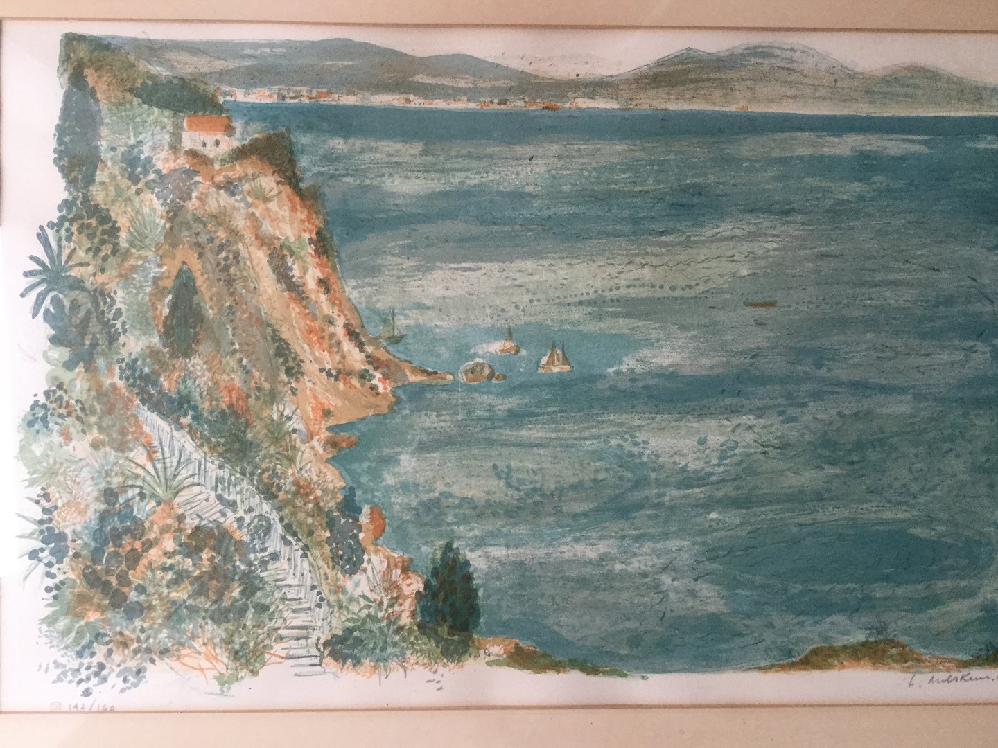 Farvelitografi af Leif Melskens 1965 - Sydlandsk bjergparti ved sø.