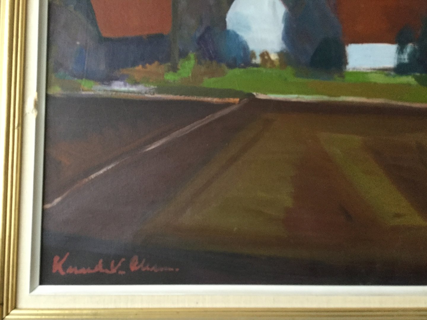Maleri af Knud V. Olesen - Landskab med marker og gårde.