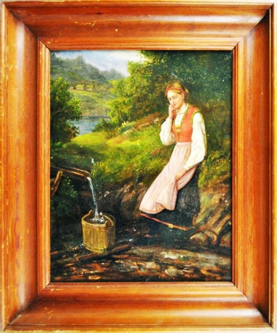 Norwegian artist, 19th century. A woman fetches water. Oil on cardboard. Unsigned. 38 x 31 cm.