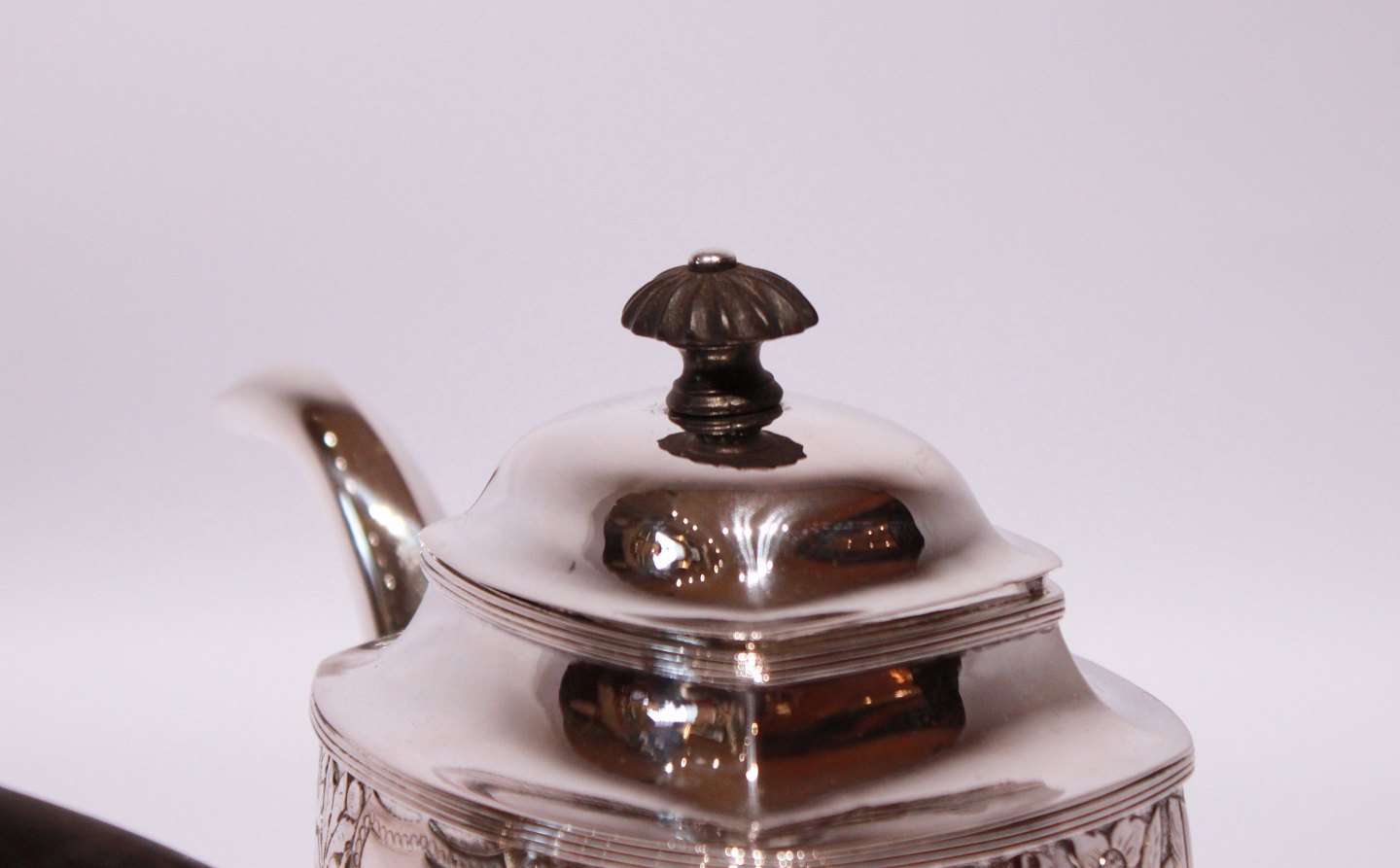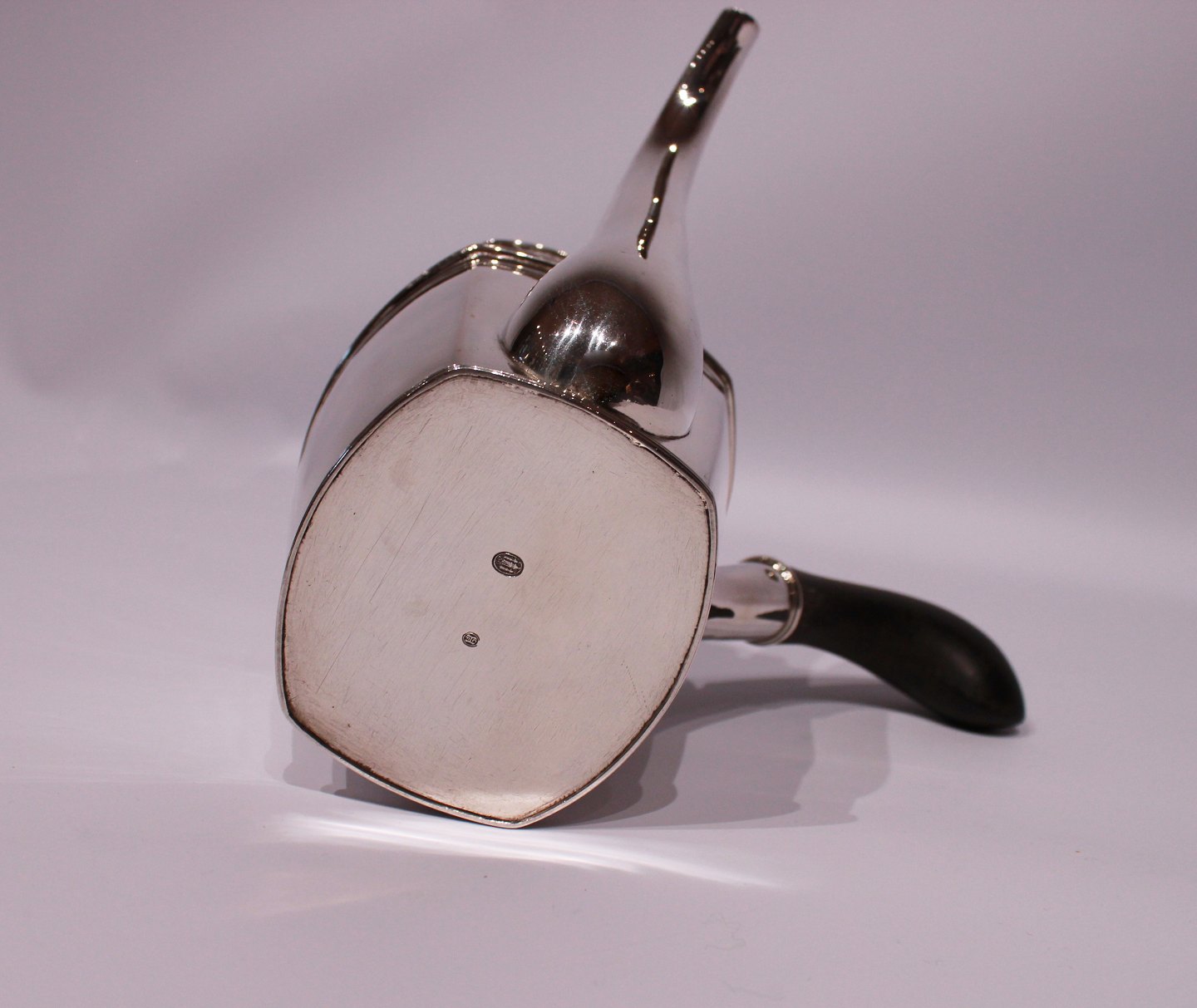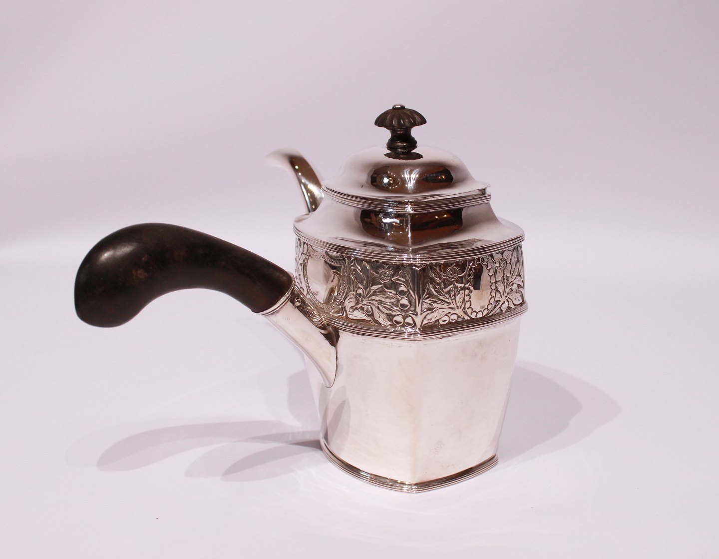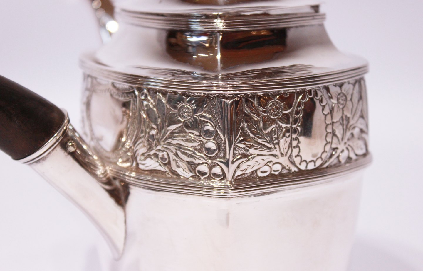 Kande dekoreret med mønster og med ibenholt håndtag, tretårnet sølv.