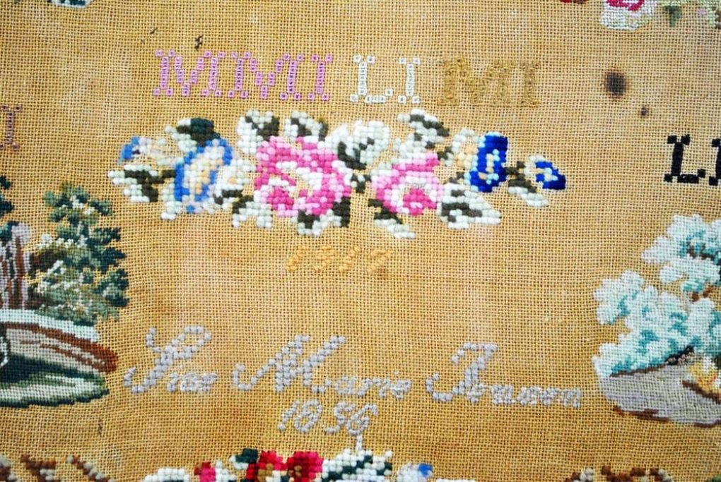 Navneklud, 1856. For Sine Marie Jensen. Danmark. Broderi. 39 x 37 cm.  Uindrammet.