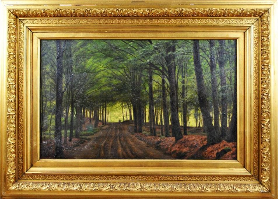 Groth, Vilhelm (1842 - 1899) Denmark. People on a road in a forest - spring. Oil on canvas. Sign.: Vilh Groth 84. 35 x 68 cm.