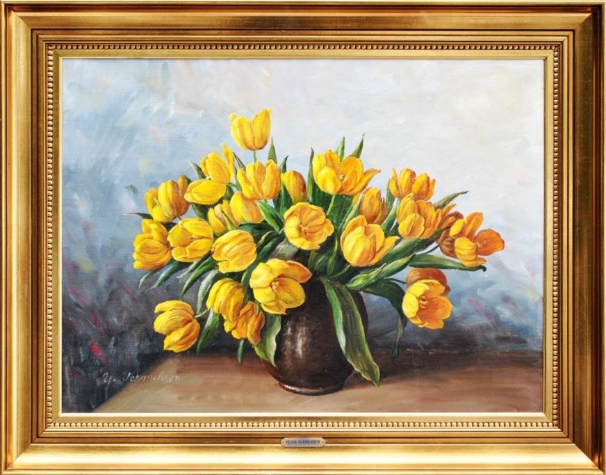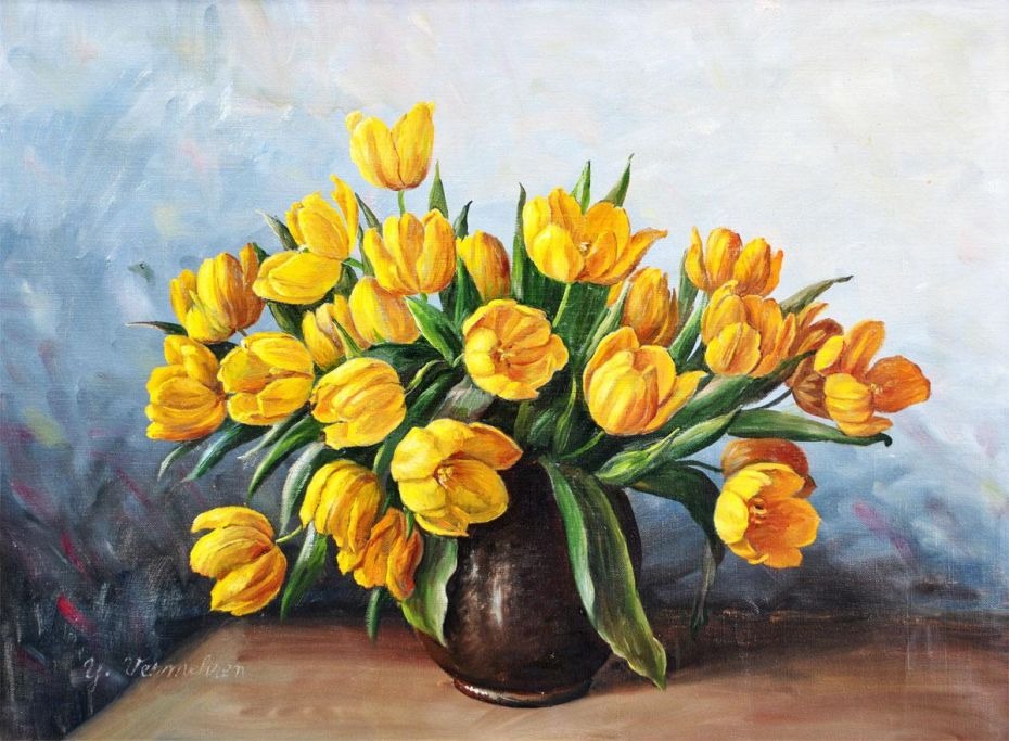 Vermehren, Yelva (1878 - 1980) Danmark. Opstilling med tulipaner på et bord. Signeret. Olie på lærred. 49 x 66 cm.